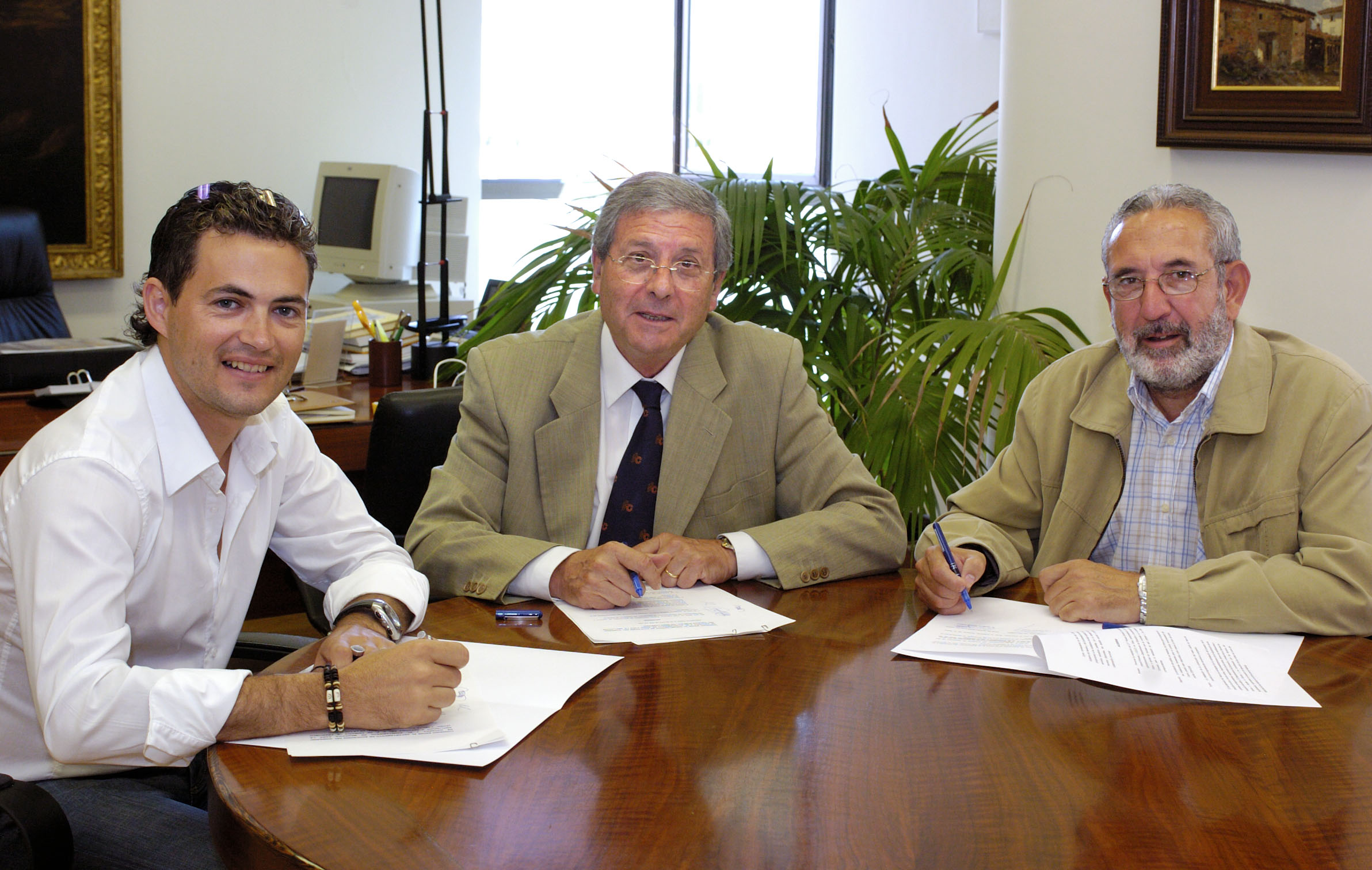 Imagen de la firma. De izda. a dcha: Samuel Caro, el cosejero Campoy y Gregorio Galilea.