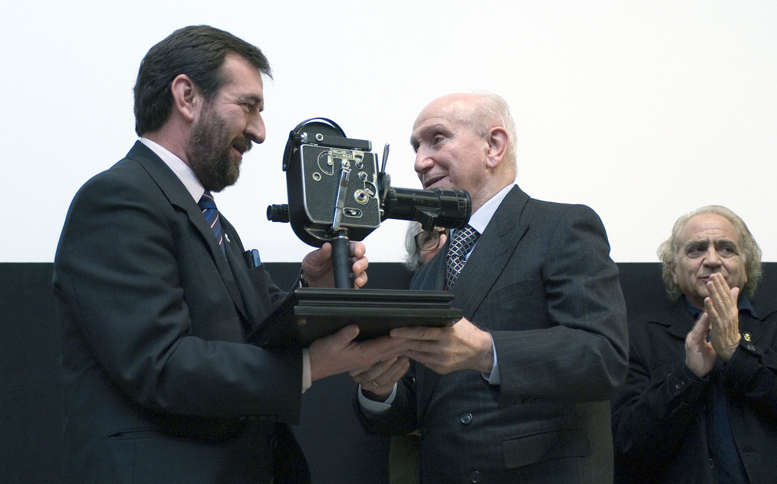 El consejero Corpas entrega a Juan Huarte el recuerdo del homenaje a la productora X Films.(ampliar imagen)