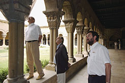 El consejero Corpas y técnicos del Instituto de Patrimonio Histórico observan un capitel del claustro el pasado mes de agosto.(ampliar imagen)