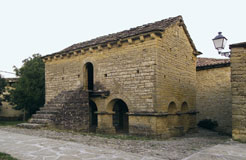 A continuación se hace la siguiente descripción: “de planta rectangular, muy pequeña, dividida en dos por un suelo de madera, posterior a la construcción del edificio, pero interesante por la colocación de los maderos a tope, recuerda algunas construcciones de la época prerrománica de los siglos X a primera mitad del XI, o quizás un poco antes, dado su parecido con lo asturiano del IX. En su interior se conserva un pilar cuadrado y debió tener otro para sostener una fila de arcos que partiese la cámara en dos naves. Son extrañísimos los arcos de las fachadas apoyados en pilares rectangulares, sin claves y con juntas en el centro, de aparejo de aspecto popular. La puerta de acceso es más moderna, quizá del siglo XVII, muy bien trabada en su haz externo y mucho menos en el interno, donde se ve claramente que fue introducida violentamente”.
