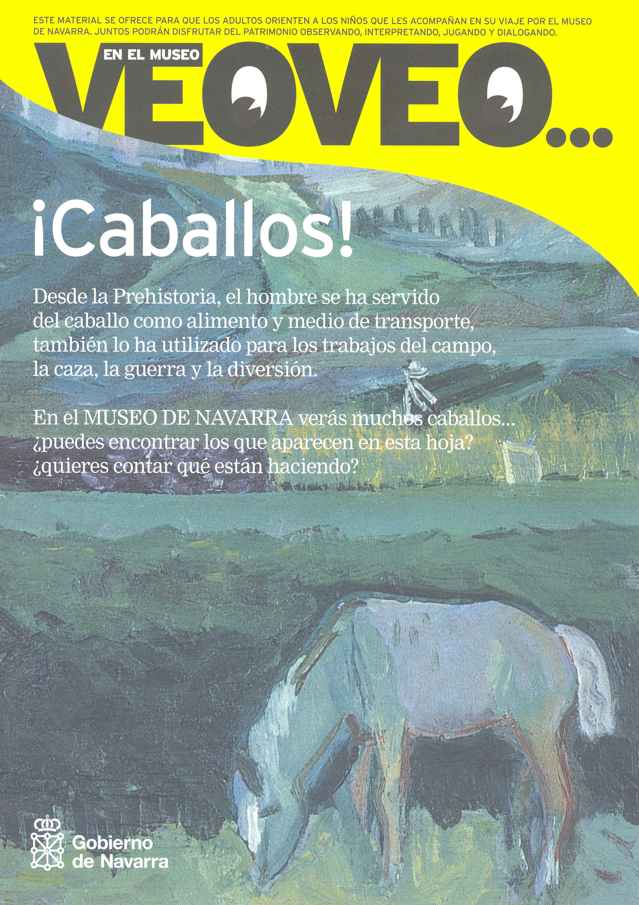 Para el primer díptico “Veo Veo en el Museo… ¡caballos!” se han seleccionado obras realizadas en diversos momentos históricos y con técnicas y materiales distintos, en las que aparecen caballos representados. Estas obras completan un recorrido por todo el Museo de Navarra. La información ofrecida es sencilla, y destaca los aspectos más comprensibles y cercanos al interés de los niños.