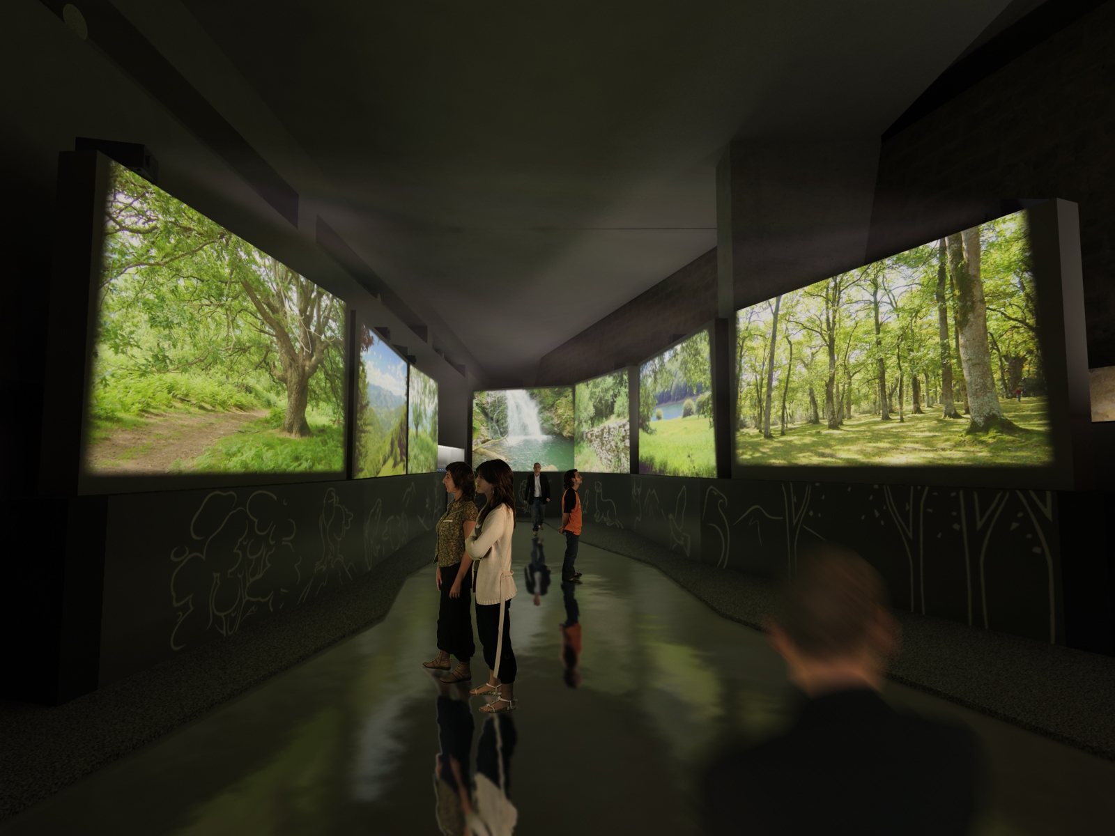Una sala de la exposición con un montaje de siete pantallas.(ampliar imagen)