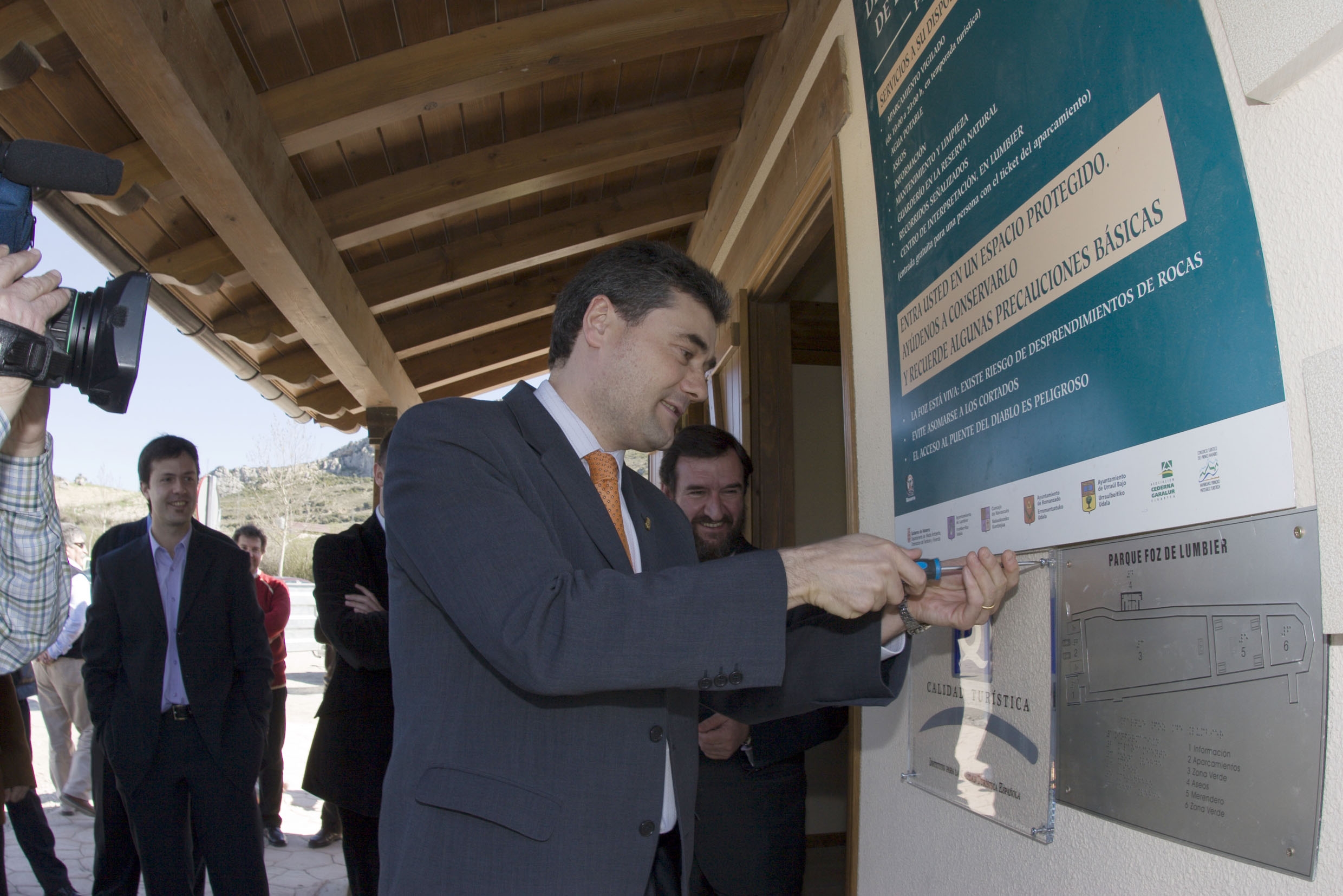 El consejero Burguete atornilla la placa de la 'Q' de calidad ante la mirada de Juan Ramón Corpas.(ampliar imagen)