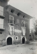 Vista general exterior de la casa de los Echeverrías en Estella, situada en la plaza de San Agustín nº 2, tomada desde el sur. En el centro, la fachada principal del inmueble, con doble acceso de medio punto, dos niveles superiores con parejas de balcones curvos de forja y entre ellos un escudo barroco y alero superior de fábrica con ventanas.