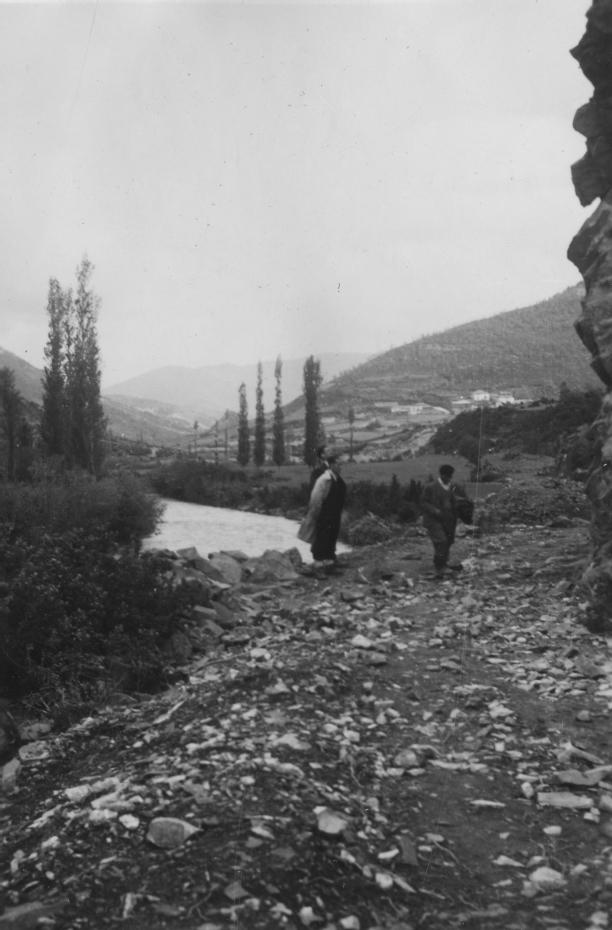 Vista general de un desmonte de roca realizado en las inmediaciones de Ongoz (Urraúl Alto) durante los trabajos de construcción de la carretera del valle de Urraúl Alto (actual NA-2100), tomada desde el sur. En primer término, la plataforma del firme de la vía discurre entre el cauce del río Areta, a la izquierda, y un saliente rocoso desmontado; sobre ella, 2 hombres con traje. Más atrás, sobre la ladera del monte Aldasur, el núcleo urbano de Ongoz.