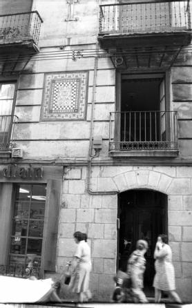 Vista parcial de la fachada de la planta baja del edificio de la calle Estafeta, número 1, de Pamplona. En primer término, 3 mujeres pasando delante del portal y, en la izquierda, el establecimiento comercial con el rótulo: (P. Gueren)diain.