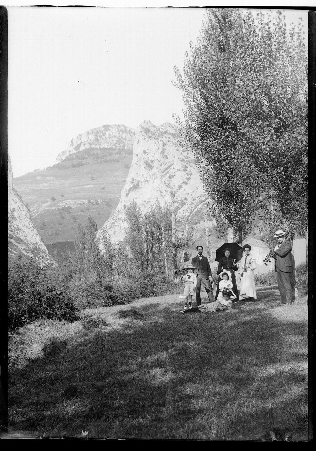Retrato colectivo de un grupo de excursionistas ante el paso de las Dos Hermanas en Irurzun, tomado desde el suroeste durante una excursión de la familia Altadill Aldave. En primer término, 2 hombres con traje y sombrero de paja flanquean a Florencia Aldave y Arteaga con vestido negro y sombrilla, otra mujer, 2 niñas y un niño, que posan sobre una pradera situada entre Irurzun y Echeverri, en el valle de Araquil. Tras ellos, el paso de las Dos Hermanas. Al fondo, el monte Mundumalkorra.