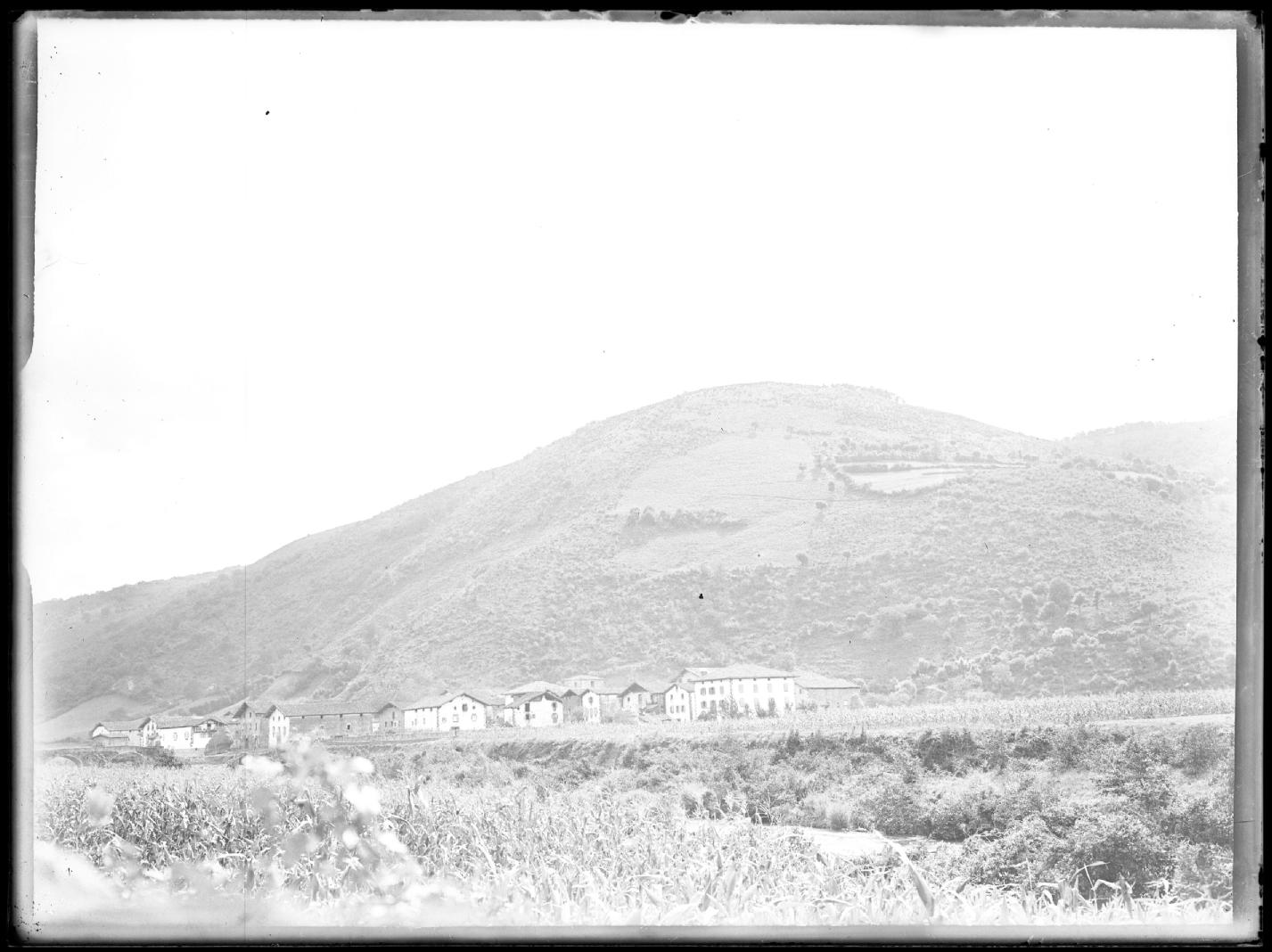 Vista panorámica del núcleo urbano de Legasa, en Bertizarana, en su entorno geográfico, tomada desde la carretera Pamplona - Irún (actual NA-1210) hacia el sureste.