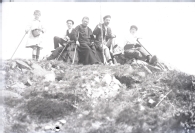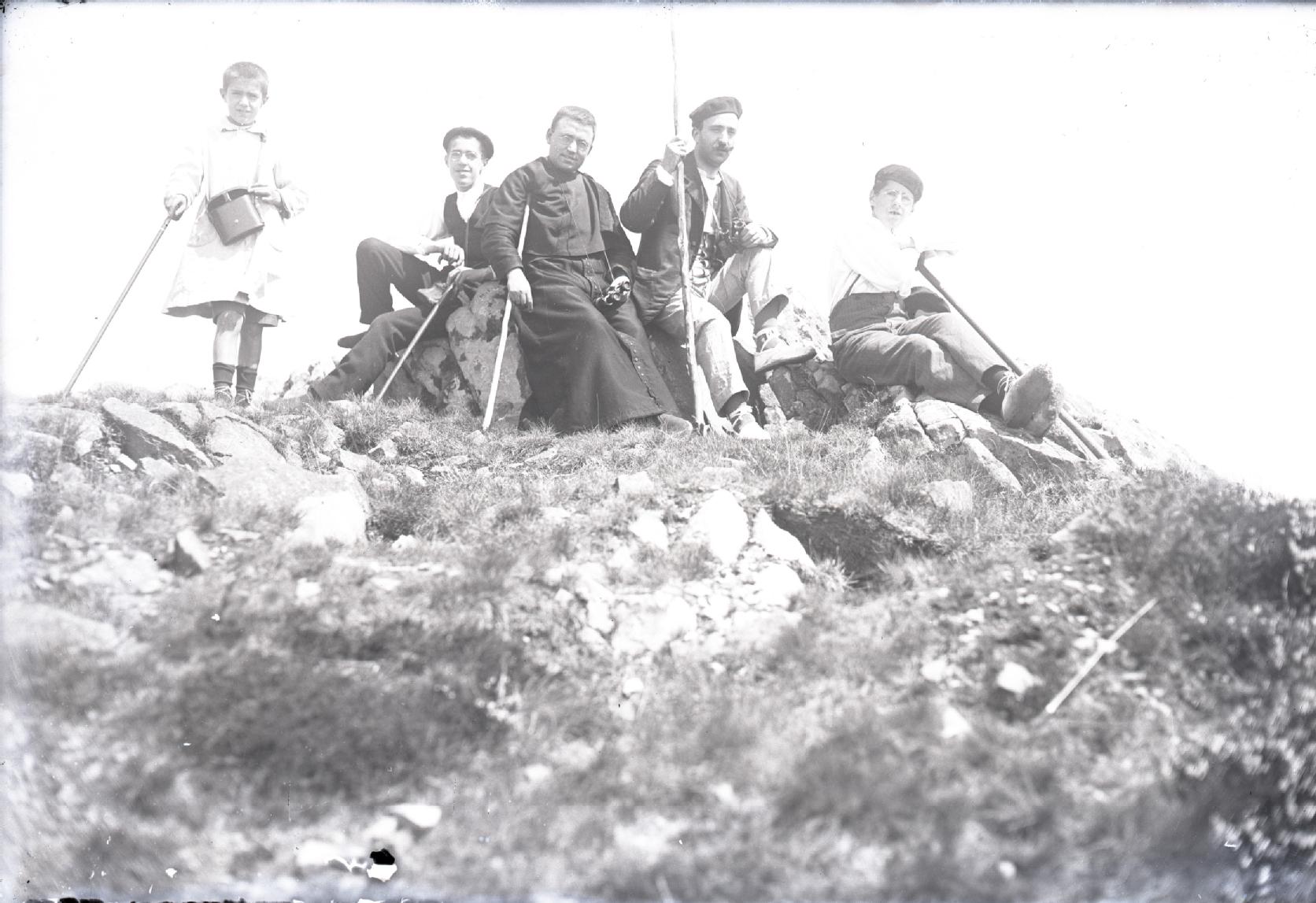 Retrato en plano entero de 5 personas en un monte. En el centro 3 hombres, el del centro un cura, y 2 niños, uno a cada lado, sentados en unas rocas.