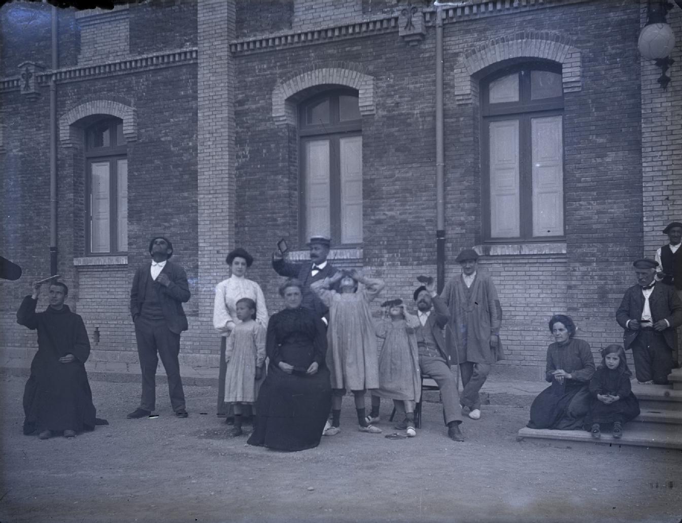 Grupo de 14 personas viendo el eclipse. En primer término un grupo en el que destaca una mujer vestida de oscuro sentada, junto a ella 3 niños, una mujer y 3 hombres; a su derecha un hombre de pie y un fraile, también sentado. A su izquierda una mujer y una niña sentadas en un escalón y detrás de ellas 2 hombres. En el fondo la fachada de ladrillo del Hospital Psiquiátrico San Francisco Javier de Navarra (antiguo Manicomio de Navarra).