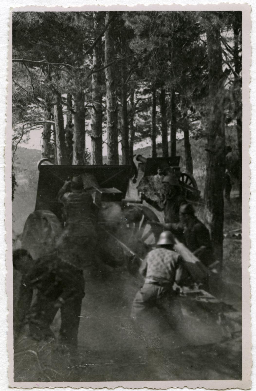 Vista de 2 cañones en el frente de Navafría en Segovia entre árboles. En primer término, un soldado y, detrás, otros 4 soldados que manipulan el primer cañón. En segundo plano, el otro cañón.