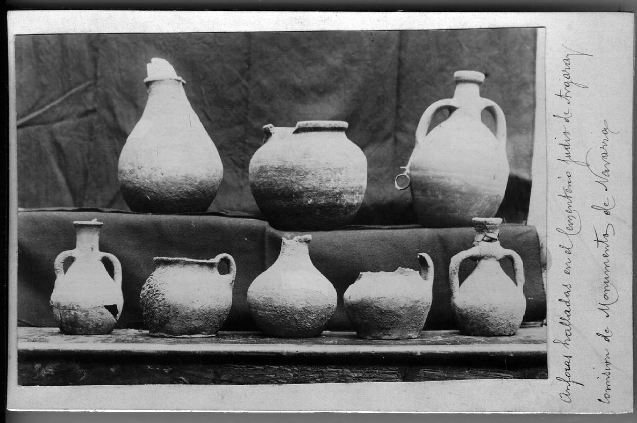 Fotografía instalada sobre soporte secundario (11x17 cm) con leyenda manuscrita inferior: "Anforas halladas en el Cementerio judio de Argaray / Comisión de Monumentos de Navarra". Es positivado del mismo negativo que la imagen CMHAN_IMG0694. La excavación se llevó a cabo entre 1895 y 1896. La imagen es anterior a la instalación de las piezas en el Museo arqueológico y artístico, abierto en su sede en 1910. La imagen podría formar parte de la colección de fotografías arqueológicas de Ansoleaga entregadas a la Comisión por sus albaceas testamentarios, de cuya recepción se dio cuenta en sesión del 20-1-1917.