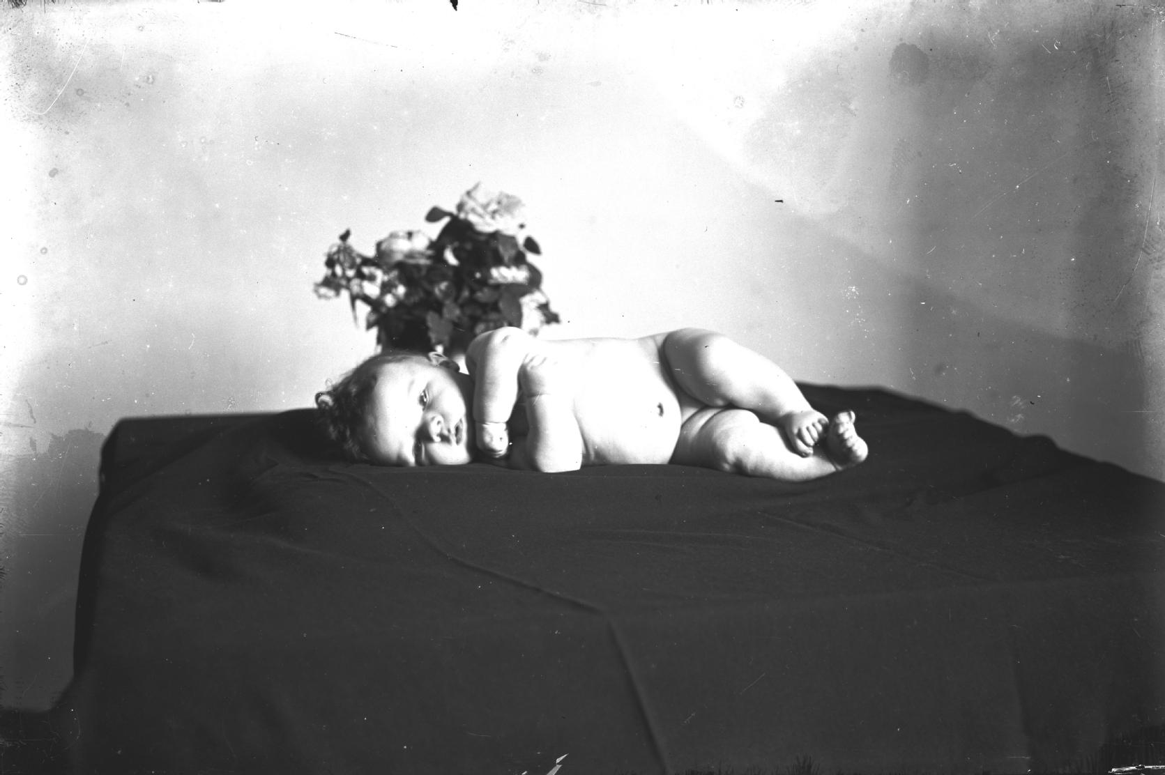 Retrato en plano entero de Jesús María, hijo de José Velasco Hernández y María Iriarte. Bebé desnudo recostado sobre el lado derecho con un jarrón con flores en segundo plano.
