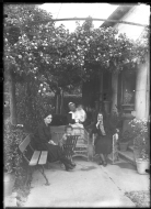 Retrato en plano entero de Juana María Altadill Aldave, sus hijos Miguel María y María Teresa y 2 mujeres en el jardín de "Garden House", casa de recreo familiar situada en el paraje de La Magdalena en Pamplona. De izquierda a de derecha, una mujer joven, Miguel María Berazaluce, una niñera con María Teresa y Juana María Altadill Aldave.