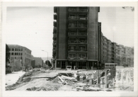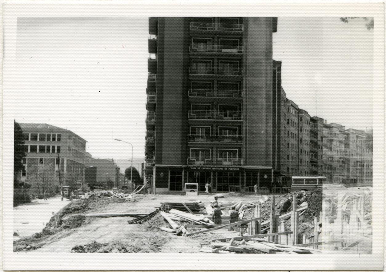 Vista de las obras de construcción de la plaza de los Fueros de Pamplona, tomada desde el norte. En primer término, 2 obreros en las obras del paso subterráneo. En segundo plano, la casa de la avenida Sancho El Fuerte y, en la izquierda el colegio Santa Catalina Labouré de la calle Abejeras.