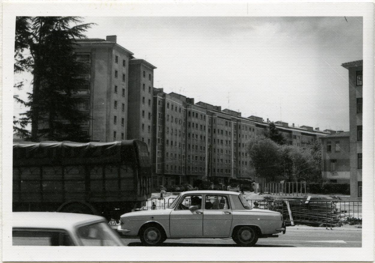 Vista de las obras de construcción de la plaza de los Fueros de Pamplona, tomada desde el norte. En primer término, vehículos circulando en la plaza. Al fondo, las casas del inicio de la avenida de Sancho El Fuerte.