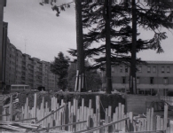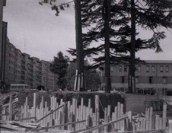 Vista de las obras de construcción de la plaza de los Fueros de Pamplona, tomada desde el noreste. En primer término,las maderas del encofrado. En segundo plano, la Casa de Misericordia y, al fondo, en la izquierda las casas de la avenida de Sancho el Fuerte.