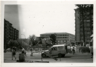 Vista de las obras de construcción de la plaza de los Fueros de Pamplona, tomada desde el norte. En primer término, varias personas y una furgoneta. En segundo plano, las casas de la avenida de Zaragoza, el colegio Santa Catalina Labouré en Abejeras y la casa de la avenida de Sancho el Fuerte.