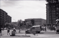 Vista de las obras de construcción de la plaza de los Fueros de Pamplona, tomada desde el norte. En primer término, varias personas y una furgoneta. En segundo plano, las casas de la avenida de Zaragoza, el colegio Santa Catalina Labouré en Abejeras y la casa de la avenida de Sancho el Fuerte.