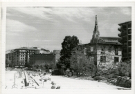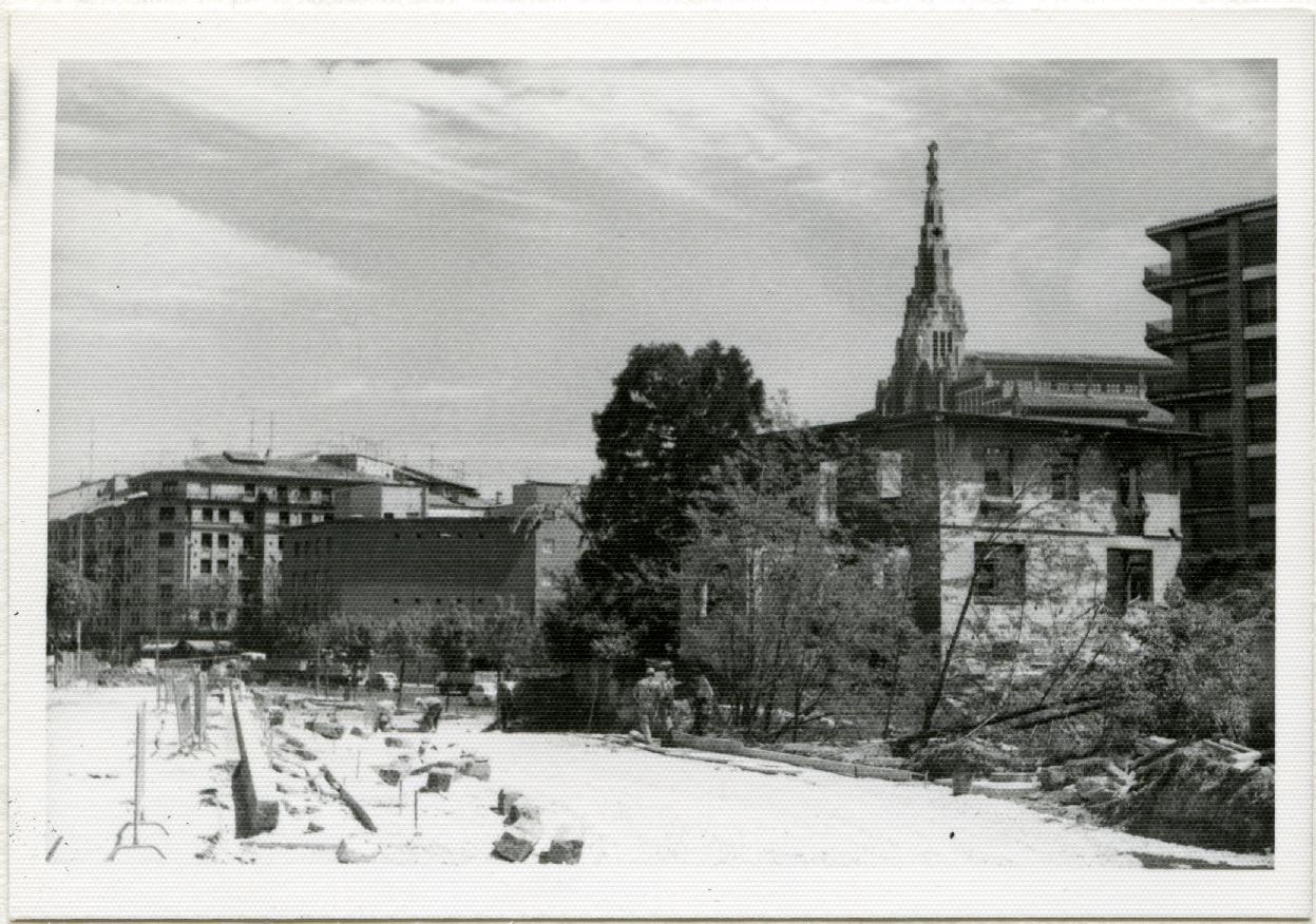 Vista de las obras de construcción de la plaza de los Fueros de Pamplona, tomada desde el sur en la avenida de Zaragoza. En la derecha, la torre de la iglesia de La Milagrosa y, al fondo, el cuartel de la Guardia Civil y el edificio de la avenida de Zaragoza, número 21.