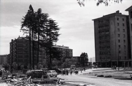 Vista de las obras de construcción de la plaza de los Fueros de Pamplona, tomada desde el noroeste. En primer término, la plaza con materiales de obra. En segundo plano, 4 árboles. Al fondo, la casa de la calle Sancho el Fuerte e inicio de la calle Abejeras. En la izquierda, las casas de la avenida de Zaragoza.