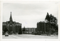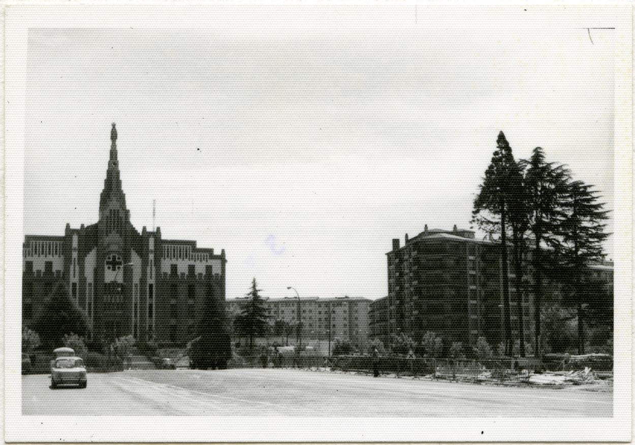 Obras de construcción de la plaza de los Fueros de Pamplona. Iglesia de La Milagrosa.