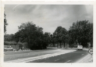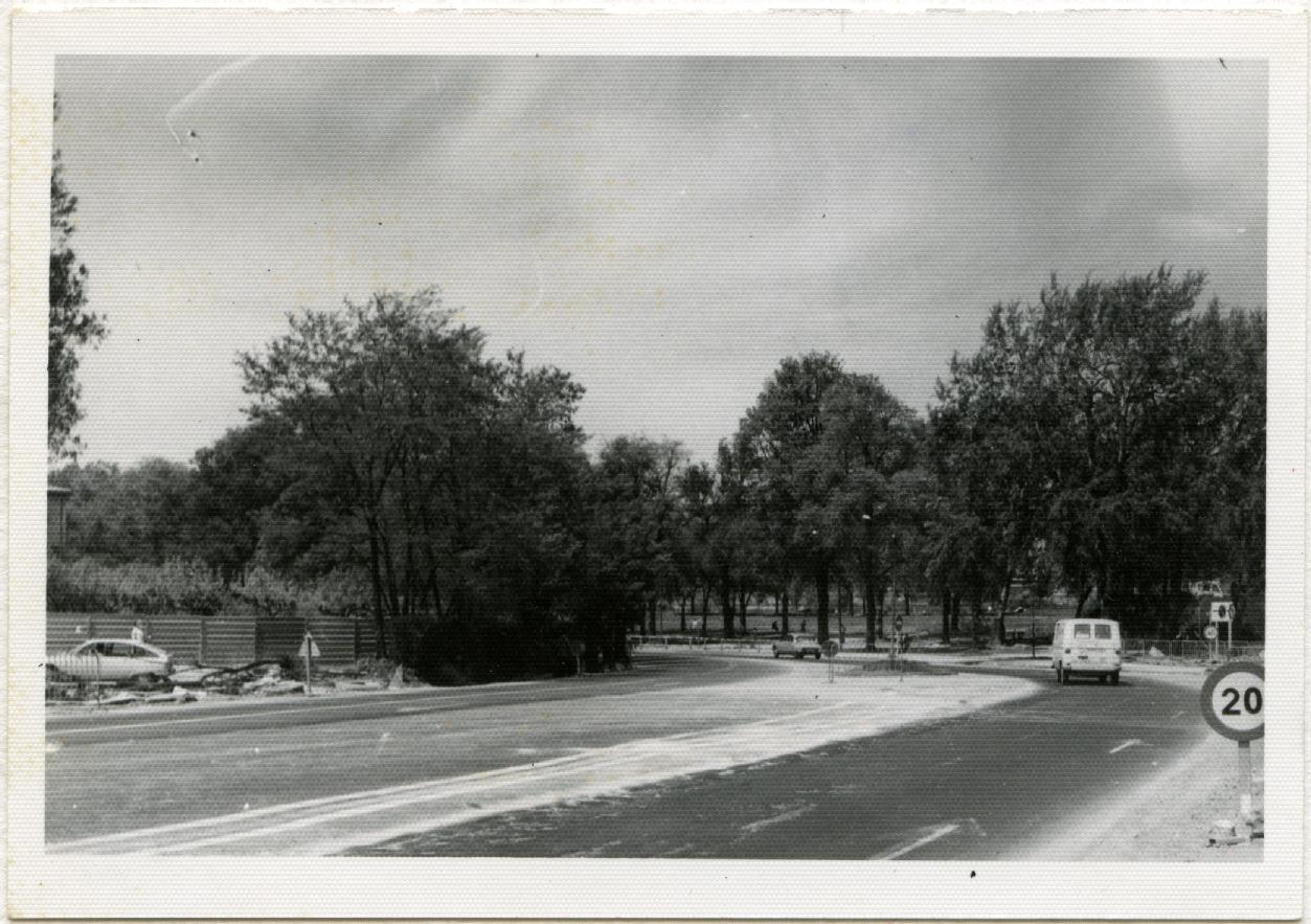 Vista de la carretera de la vuelta del Castillo durante la construcción de la plaza de los Fueros de Pamplona, tomada desde el este. En primer término, la carretera y 2 vehículos circulando. Al fondo, los árboles de la Casa de Misericordia y del parque.