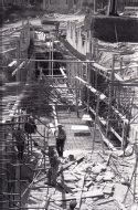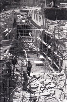 Vista de las obras Vista de las obras de construcción de la plaza de los Fueros de Pamplona. Excavación y encofrado para uno de los pasos subterráneos. En primer término, 2 obreros junto a la estructura de hierro y madera.
