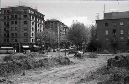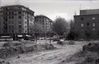 Vista de las obras de construcción de la plaza de los Fueros de Pamplona, tomada desde el oeste. En primer término, la plaza y, en segundo plano, la avenida de Galicia. En la izquierda, el edificio número 21 de la avenida de Zaragoza y, en la derecha, el cuartel de la Guardia Civil.