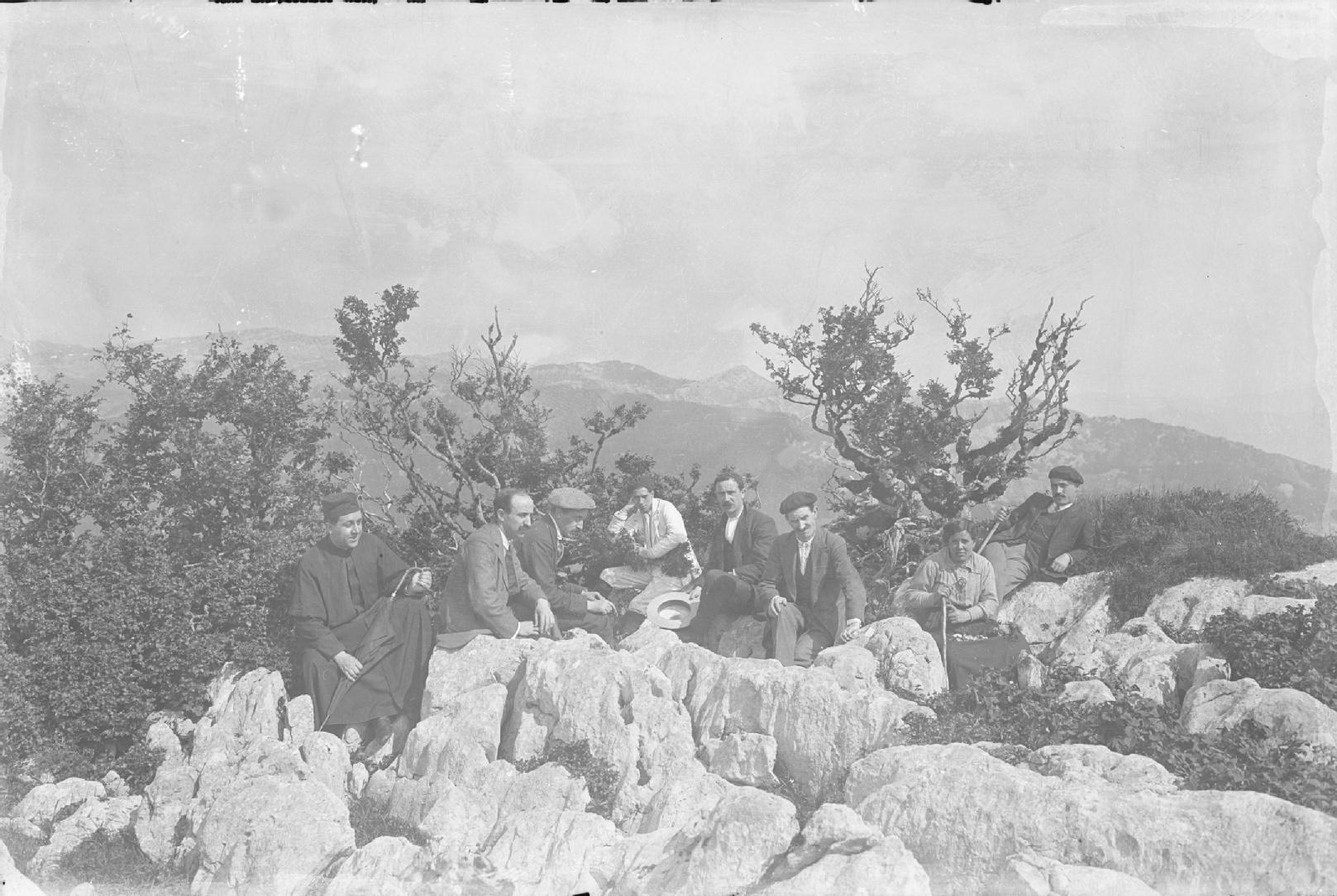 Retrato en plano entero de un grupo de personas sentados sobre unas rocas en la sierra de Aralar. En primer término 7 hombres, uno de ellos cura, y una mujer sentados, detrás unos árboles y al fondo los montes del entorno.