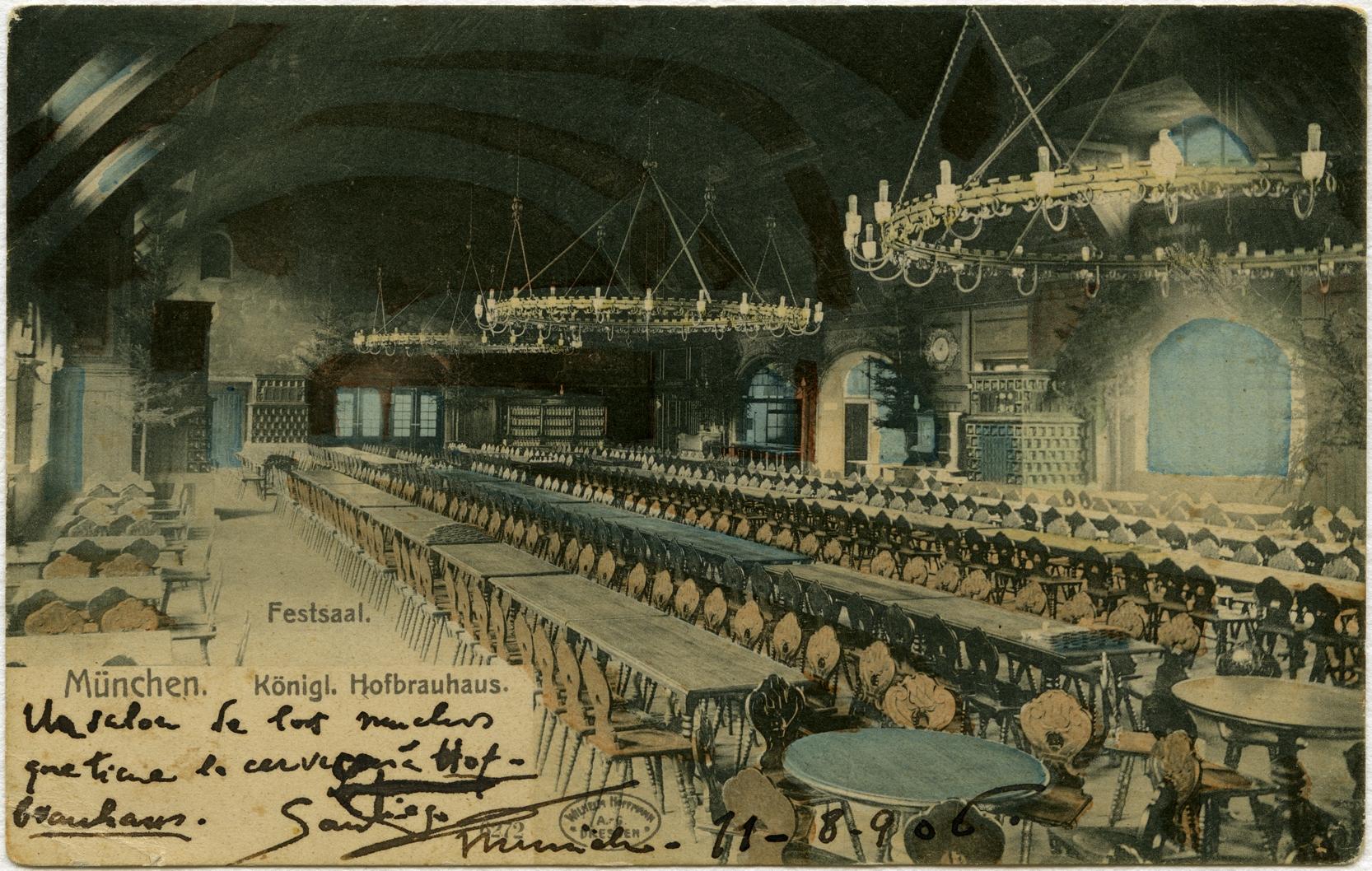 Vista del salón interior de la cervecería Kgl. Hofbräuhaus de Munich en el que se celebra la fiesta de la cerveza. Texto impreso: Festsaal. München. Königl. Hofbrauhaus, y texto manuscrito de correspondencia privada con fecha 11 de agosto de 1906 de Santiago Vengoechea a Santos Laspiur.