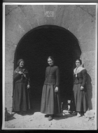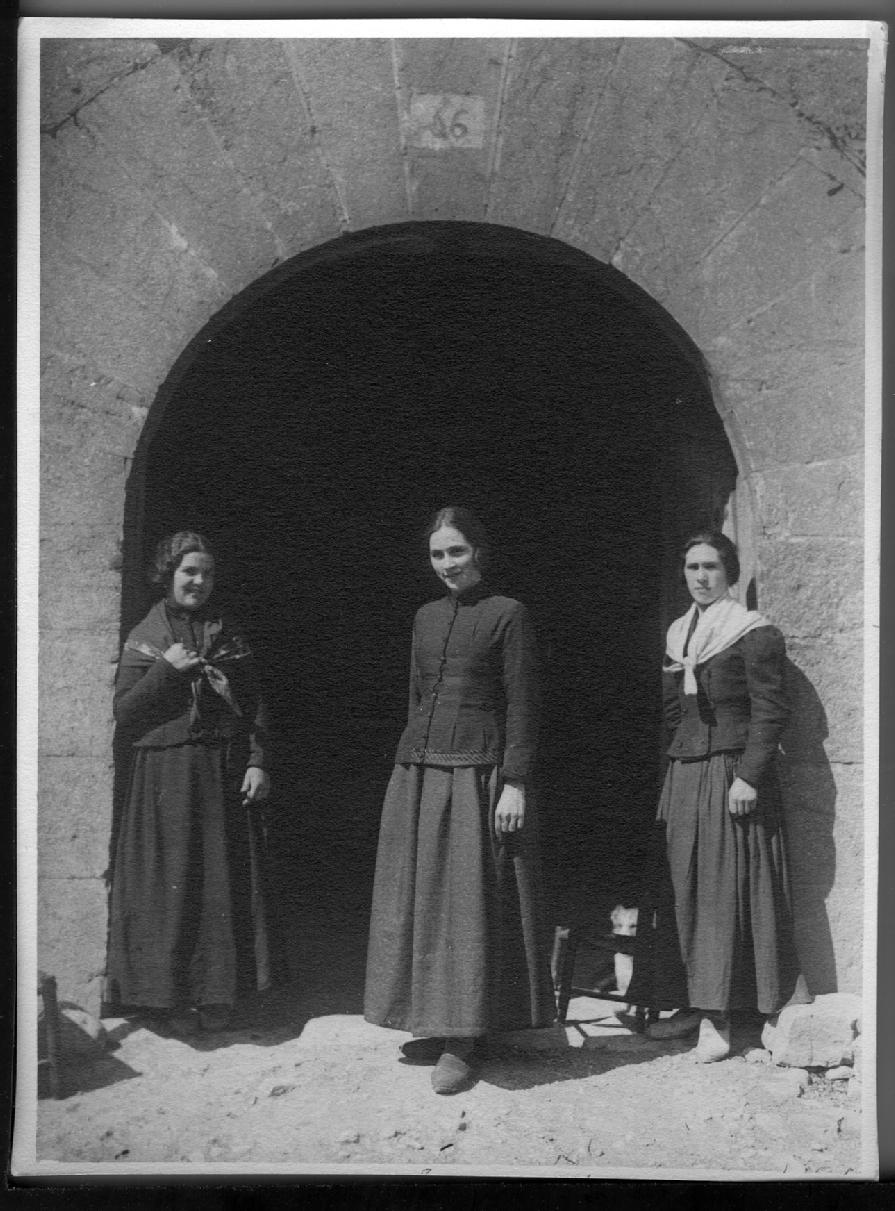 Retrato colectivo de un grupo de mujeres barranquesas vestidas con indumentaria tradicional del valle de Araquil, tomado en Yábar. En primer término, 3 mujeres jóvenes con los trajes propios de las muchachas del valle, ante la portada de una casa.