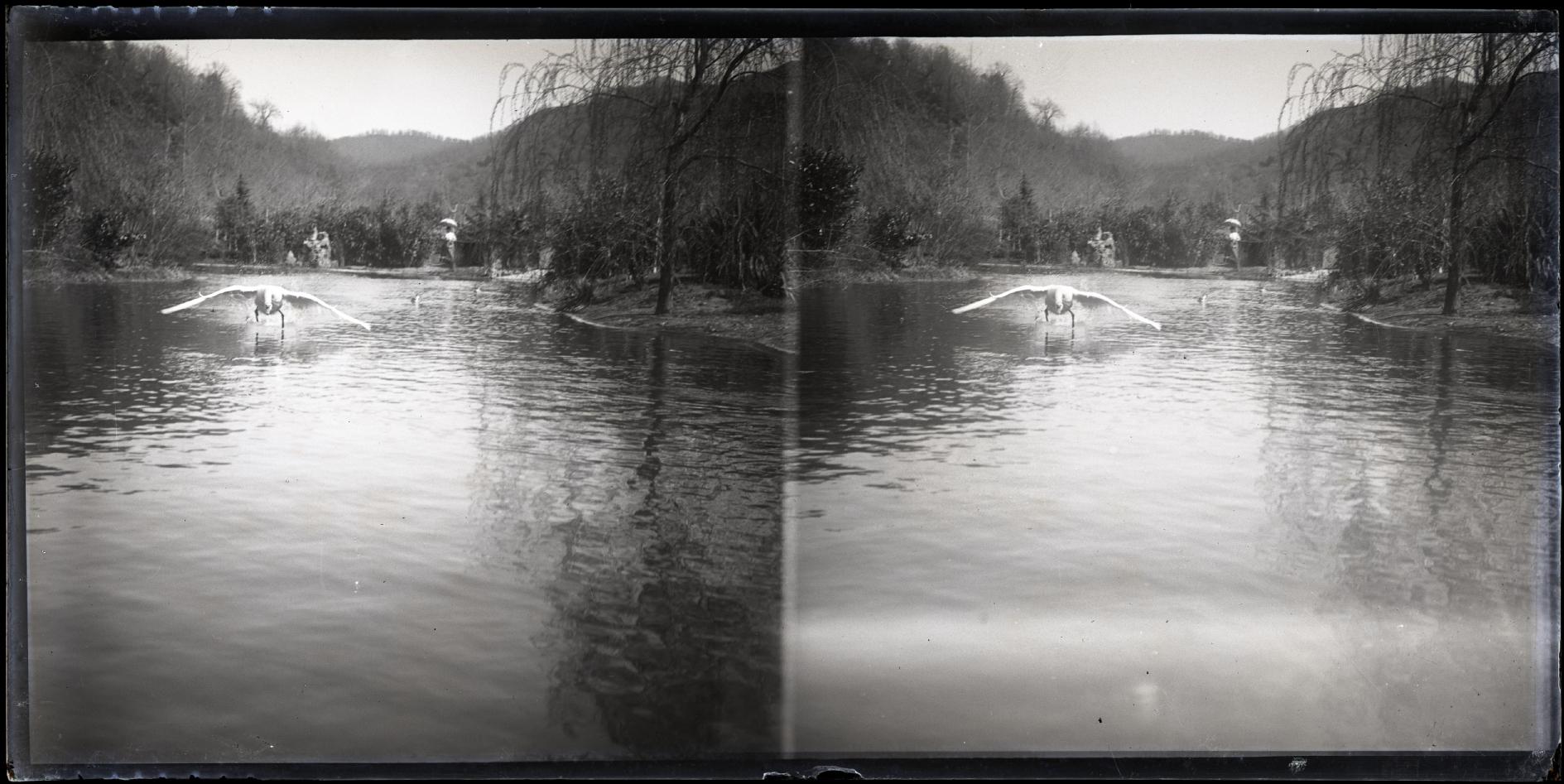 Vista de un cisne en el momento que levanta el vuelo sobre el agua del estanque del Señorío de Bertiz en Oyeregui, Bertizarana. Al fondo, una mujer con sombrilla.