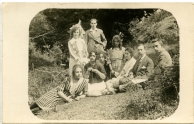 Retrato colectivo de un grupo de jóvenes excursionistas en un bosque, tomado durante una estancia de verano de la familia Altadill Aldave en Burguete. Entre los jóvenes, las hermanas María (primera fila, segunda por la izquierda) y Jenara (primera fila, en el centro, de rodillas) Altadill Aldave.