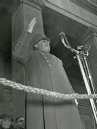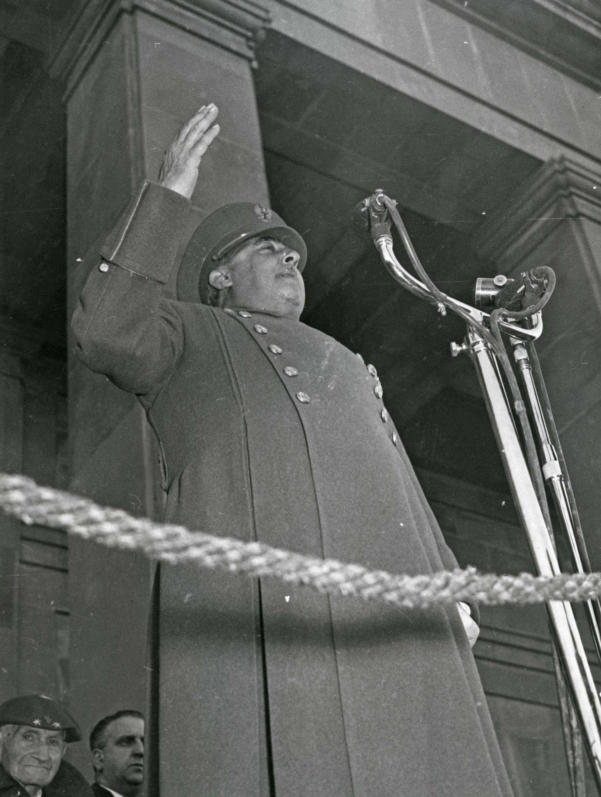 Retrato de tres cuartos en contrapicado del general Francisco Franco Bahamonde, tomado durante su discurso en el acto político celebrado en Pamplona, ante el Monumento a los Caídos.
