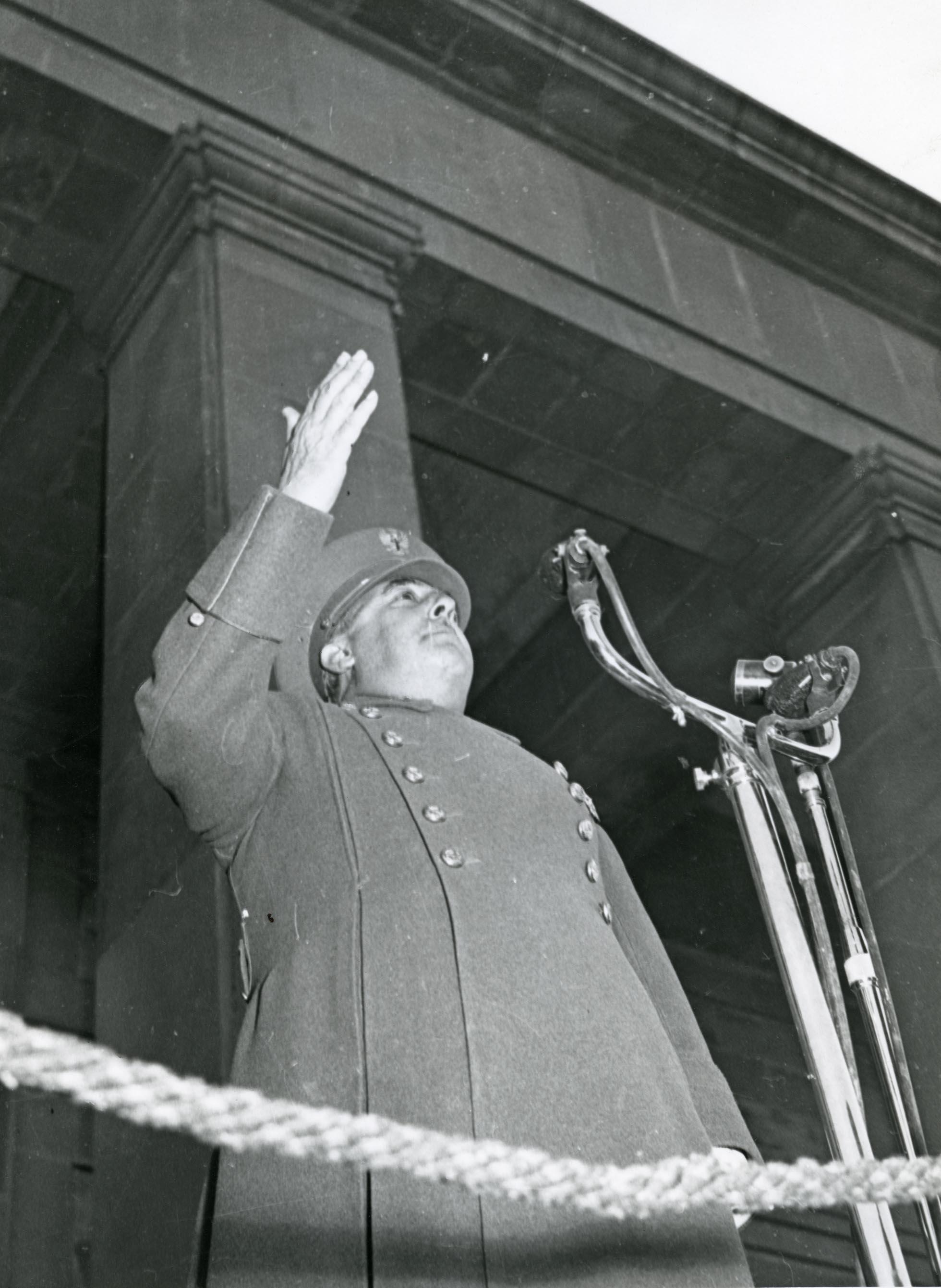 Retrato de tres cuartos en contrapicado del general Francisco Franco Bahamonde, tomado durante su discurso en el acto político celebrado en Pamplona, ante el Monumento a los Caídos.