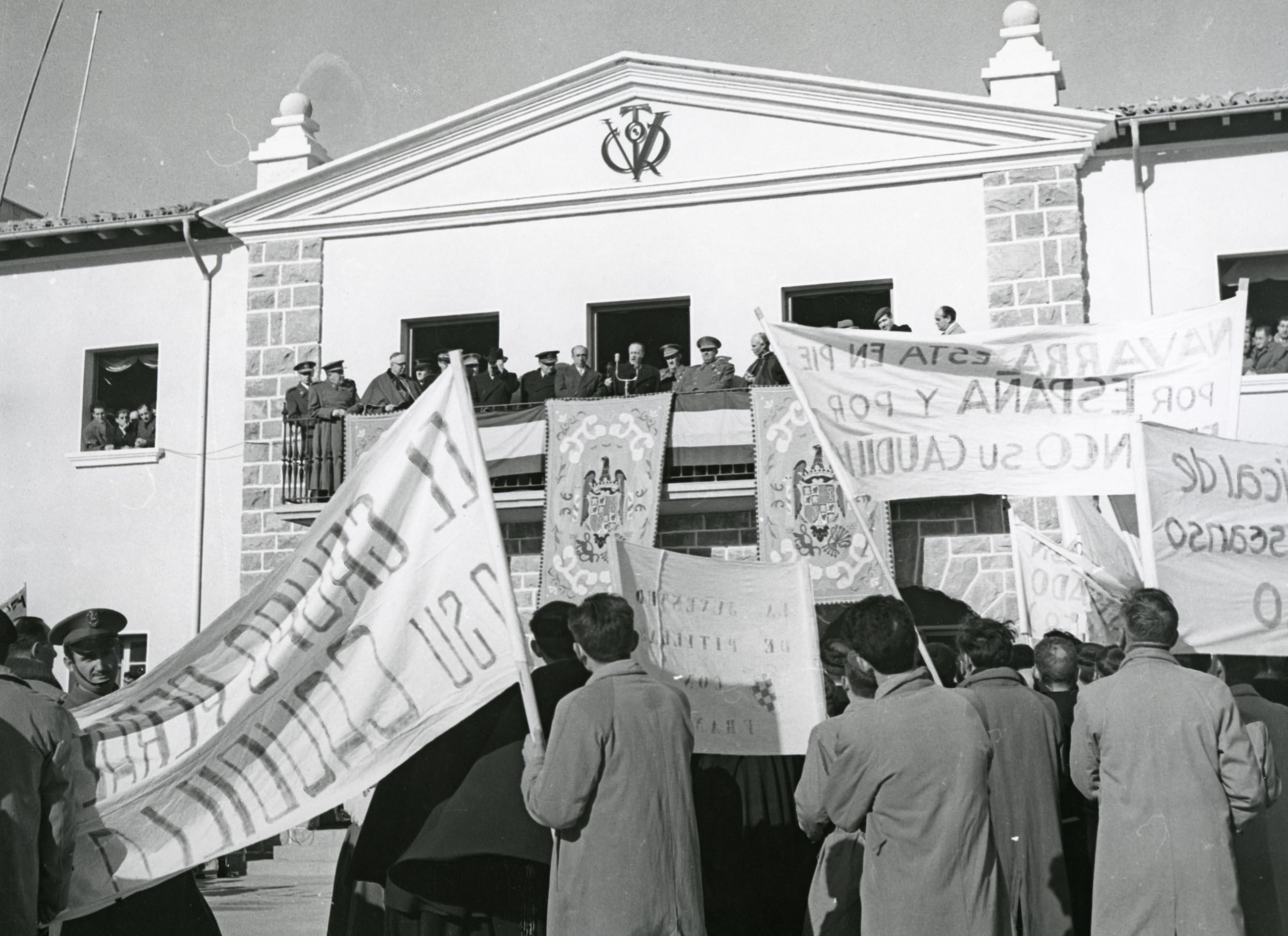 Vista parcial del acto celebrado en el edificio social del barrio de la Chantrea con motivo de la visita del jefe del Estado, general Franco, tomada durante el discurso del ministro secretario general del Movimiento. En primer término, el público congregado con pancartas. Tras ellos, la fachada del edificio presidida por un Víctor y las autoridades sobre el balcón, engalanado con banderas y reposteros. Entre ellas, Enrique Delgado Gómez, obispo de Pamplona (tercero por la derecha); Raimundo Fernández Cuesta, ministro secretario general del Movimiento (décimo, en el centro tras los micrófonos); el general Francisco Franco Bahamonde (duodécimo); y Manuel Frindade Salgueiro, obispo auxiliar del patriarcado de Lisboa y arzobispo honorífico de Mitilene (decimotercero).