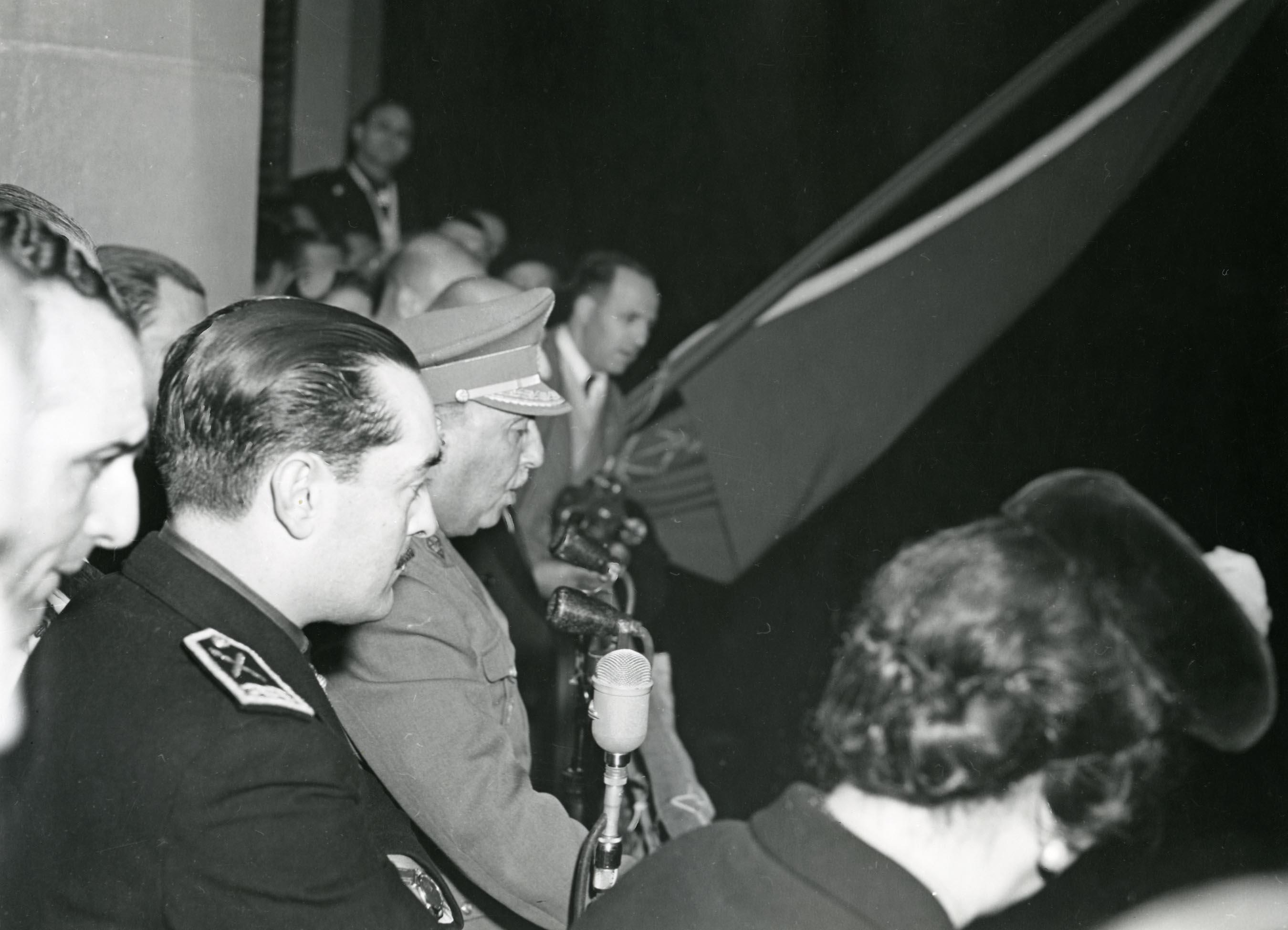Vista parcial del balcón del Palacio de Navarra en Pamplona durante el discurso ofrecido por el jefe del Estado, general Franco, en su viaje a Navarra. En primer término, un hombre; Luis Valero Bermejo, gobernador civil de Navarra; el general Francisco Franco Bahamonde ante los micrófonos; y Carmen Polo de Franco, de espaldas. Al fondo, otras autoridades.