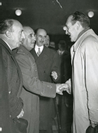 Detalle de la ceremonia de entrega de llaves por el jefe del Estado, general Franco, a beneficiadios de vivienda protegida construida por el Instituto Nacional de la Vivienda en el barrio de la Chantrea de Pamplona. A la izquierda, Federico Mayo Gayarre, director del Instituto Nacional de la Vivienda; el general Francisco Franco Bahamonde, que tiene la mano a un vecino; Antonio Archanco Zubiri, secretario del Patronato Benefico de la Construcción "Francisco Franco", y otras autoridades. A la derecha, un vecino que recibe el saludo del general.