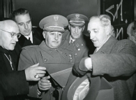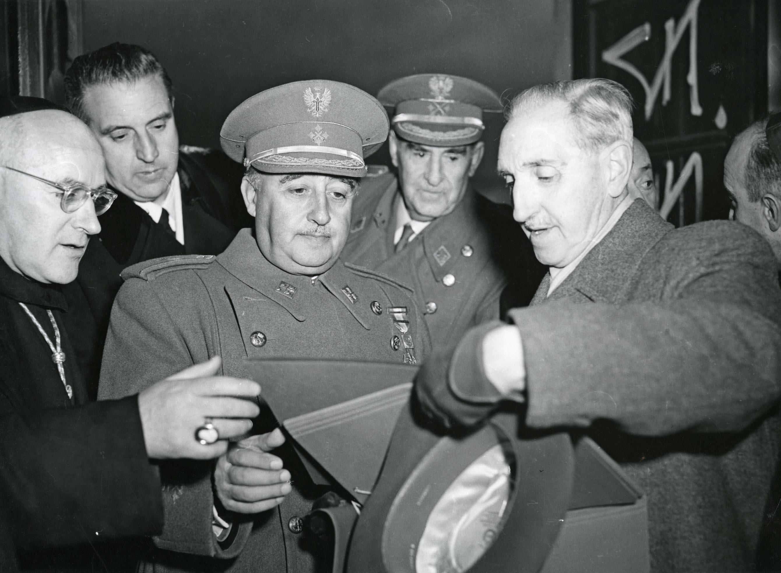 Detalle de la visita del jefe del Estado, general Franco, al monasterio de Leire (Yesa) durante su viaje Javier con motivo de la clausura de los actos conmemorativos del IV centenario de la muerte de San Francisco Javier. En el centro, el general Francisco Franco Bahamonde atiende a las explicaciones que le ofrece el arquitecto José Yárnoz Larrosa sobre la documentación que le muestra; junto a ellos, a la izquierda, Francisco Javier Ochoa Ullate, agustino recoleto y obispo titular de Remesiana (Serbia). Detrás, otros dos hombres de la comitiva del jefe del Estado.
