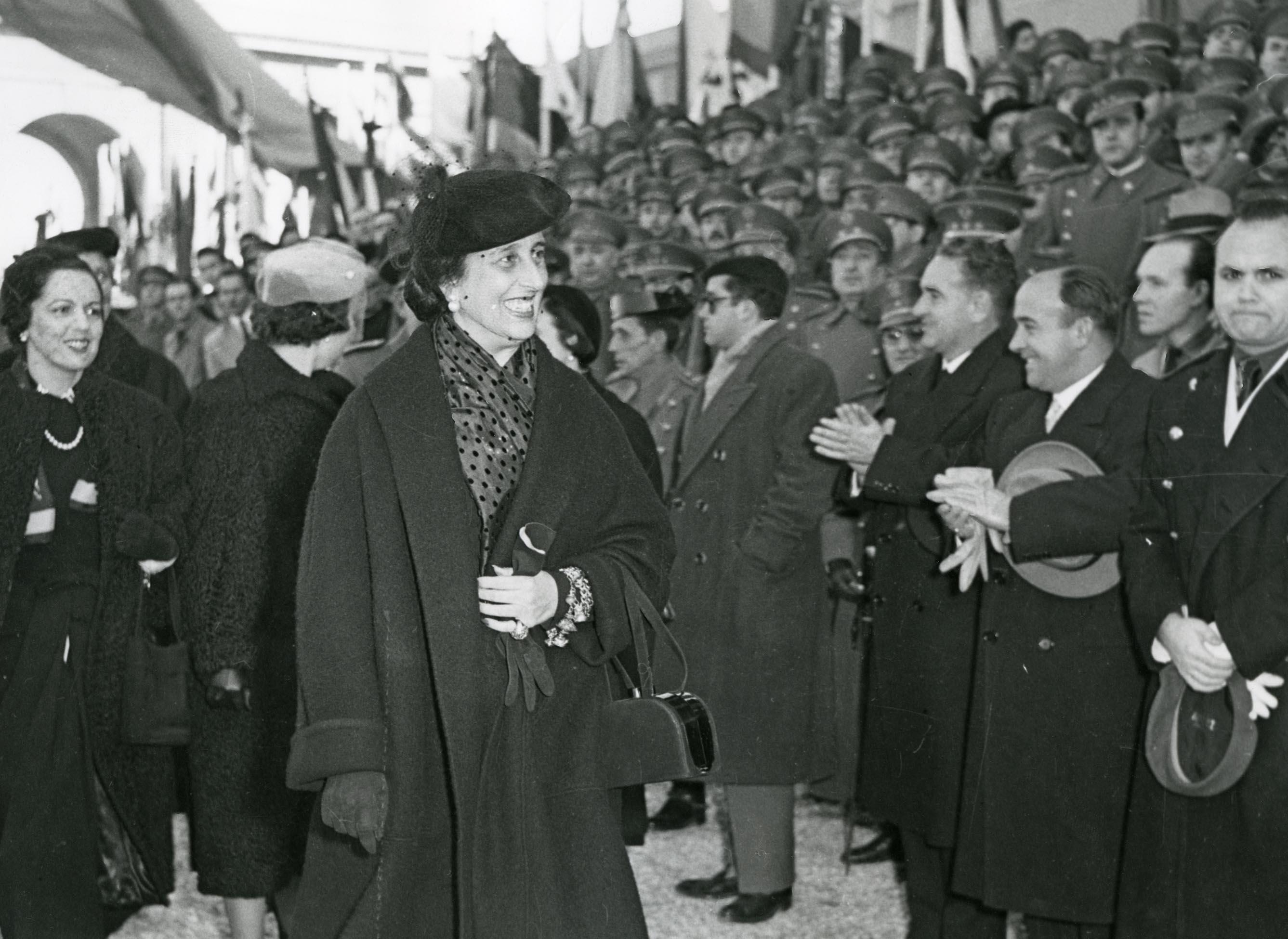 Detalle de la llegada de la mujer del jefe del Estado al acto político celebrado en Pamplona ante el Monumento a los Caídos. A la izquierda, Carmen Polo de Franco, esposa del jefe del Estado, avanza por la explanada a la cabeza de un grupo de mujeres. A la derecha, una multitud de militares y autoridades gubernamentales, sobre la escalinata del edificio.