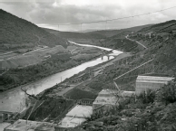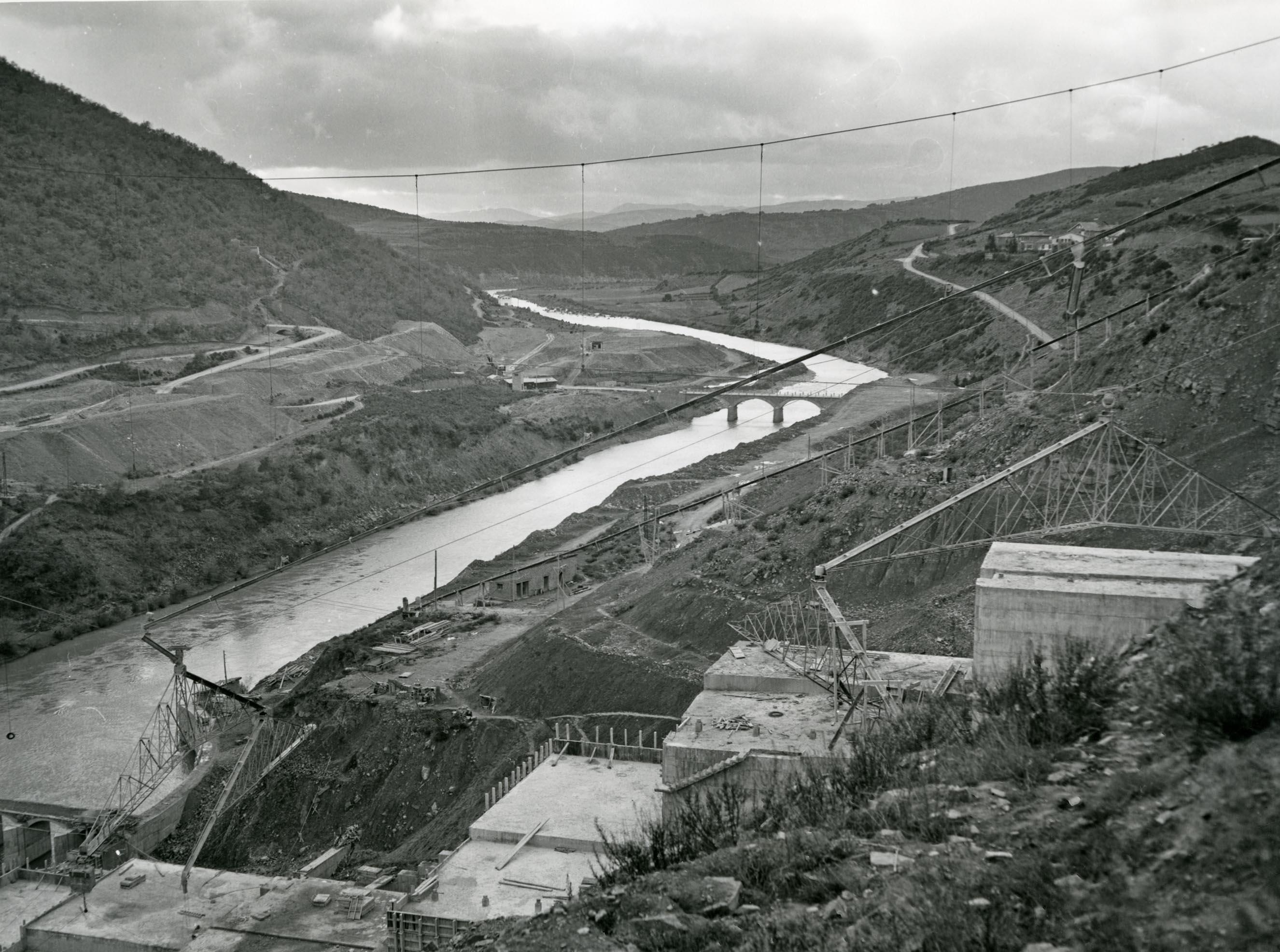 Vista general de las obras de construcción de la presa del embalse de Yesa, tomada aguas arriba de la presa desde la margen derecha durante la visita del jefe del Estado, general Franco. En primer término, pared de la presa en construcción y, bajo ella, el curso del río Aragón. Al fondo, sobre la margen derecha, el núcleo urbano de Yesa.