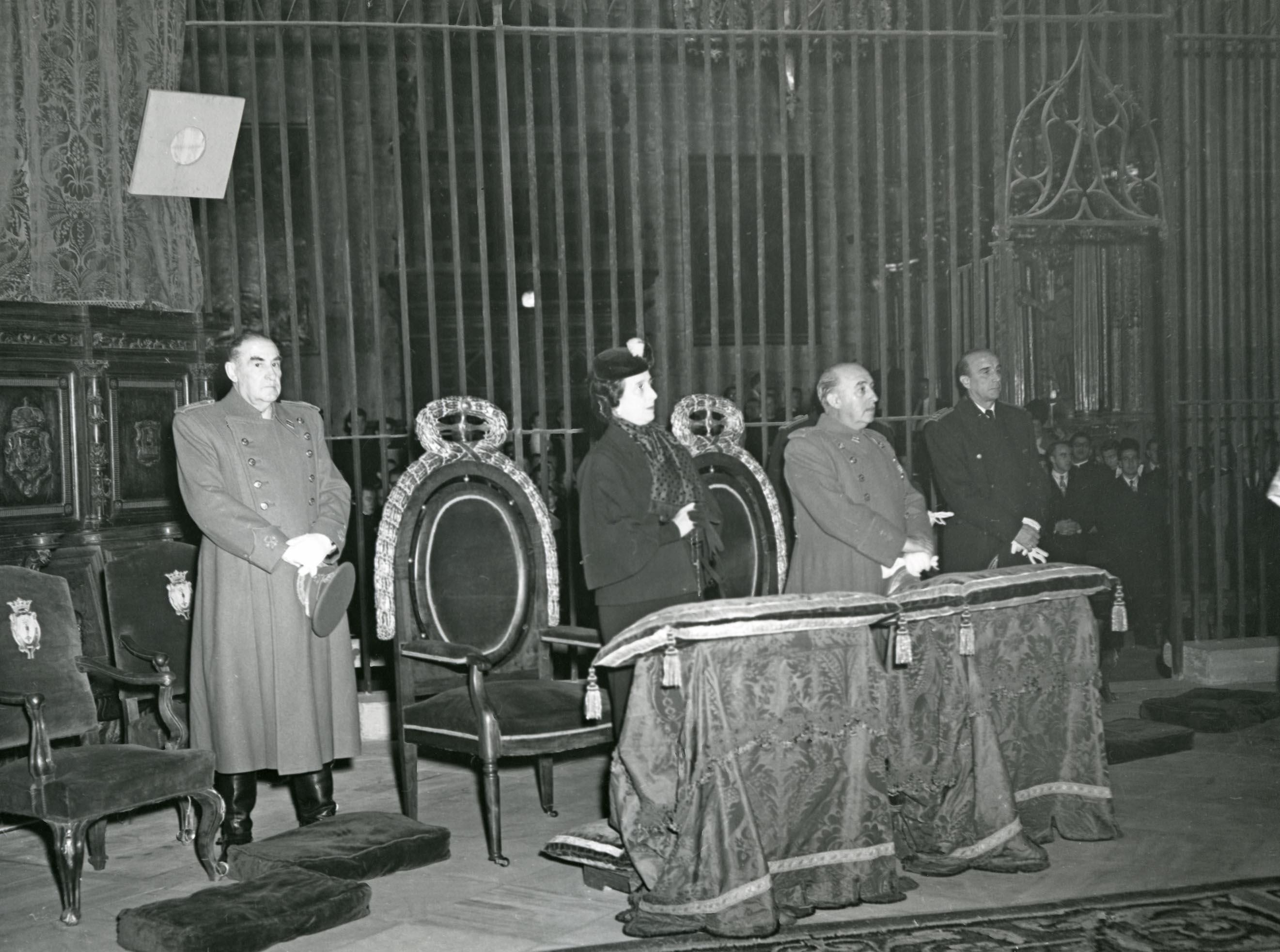 Vista general de los sitiales de honor del jefe del Estado, general Franco, y su esposa en el Te Deum celebrado en la catedral de Pamplona con motivo de su viaje a Navarra. En primer término, en el centro, Carmen Polo de Franco y el general Francisco Franco Bahamonde en los sitiales de honor del presbiterio, flanqueados por miembros de las casas civil y militar del jefe del Estado. Al fondo, tras la reja, otras autoridades sentadas en el brazo del crucero del templo.