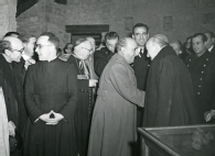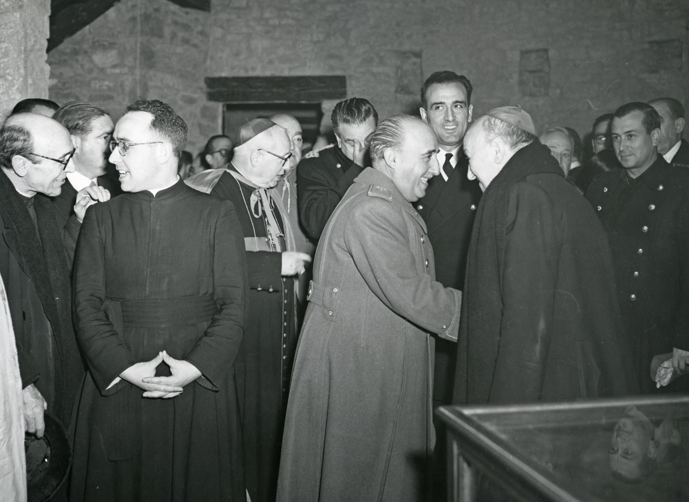 Vista general del saludo del jefe del Estado, general Franco, a Luciano Pérez Platero, arzobispo de Burgos, en el castillo de Javier durante su viaje para asisitir a la clausura de los actos conmemorativos del IV centenario de la muerte de San Francisco Javier. En el centro, el general Francisco Franco Bahamonde saluda al arzobispo de Burgos, Luciano Pérez Platero. Tras ellos, el obispo de Pamplona, Enrique Delgado Gómez, y un grupo de militares.