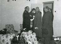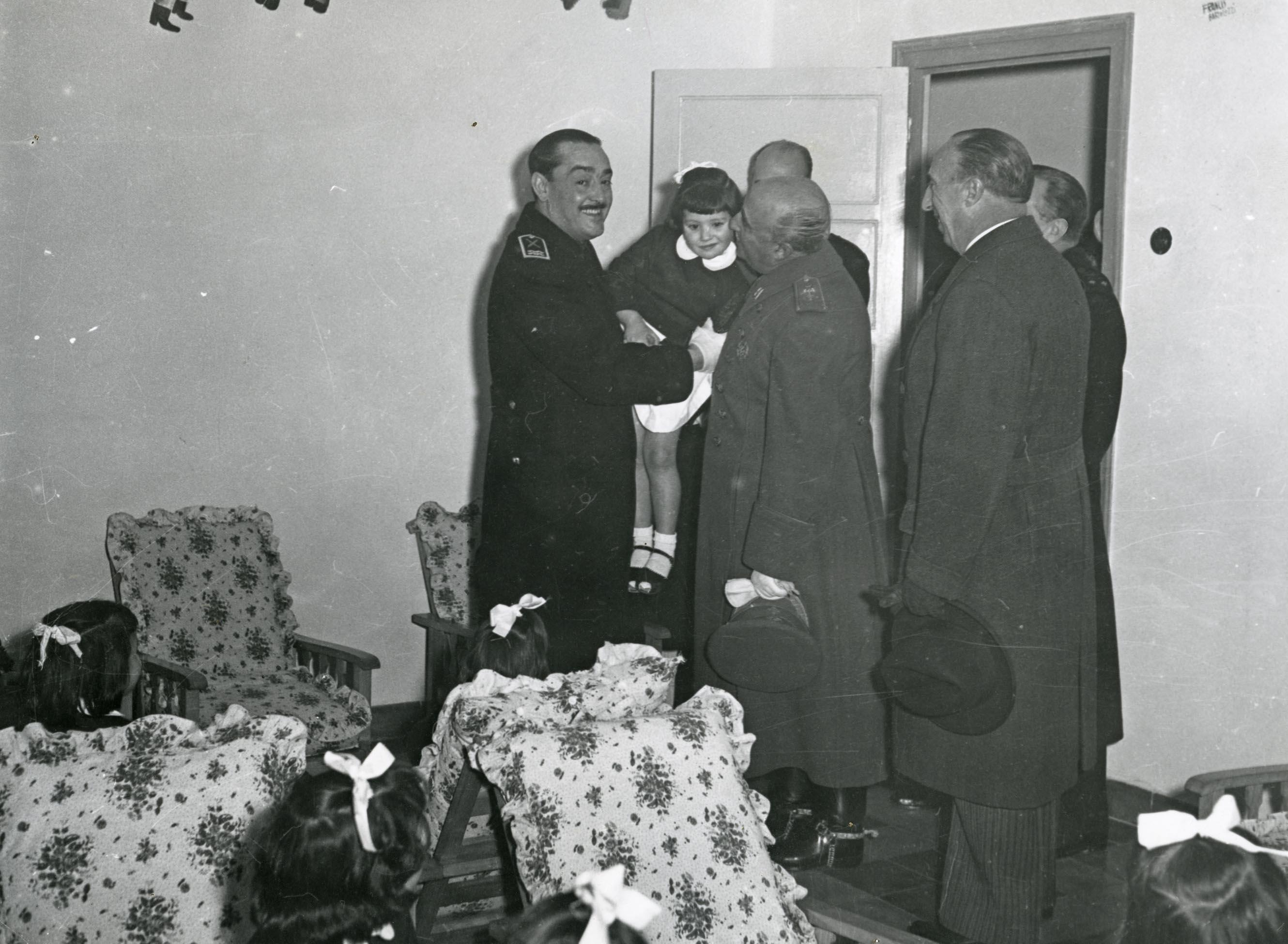 Detalle de la visita del jefe del Estado, general Franco, al Jardín Maternal instalado por el Instituto Nacional de la Vivienda en el barrio de la Chantrea (conocido popularmente como Casa Cunas), en Pamplona. En una dependencia con butacas para niños, Luis Valero Bermejo, gobernador civil de Navarra, sostiene en brazos a una niña que recibe un beso del general Francisco Franco Bahamonde. Junto a ellos, Federico Mayor Gayarre, director del Instituto Nacional de la Vivienda.