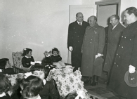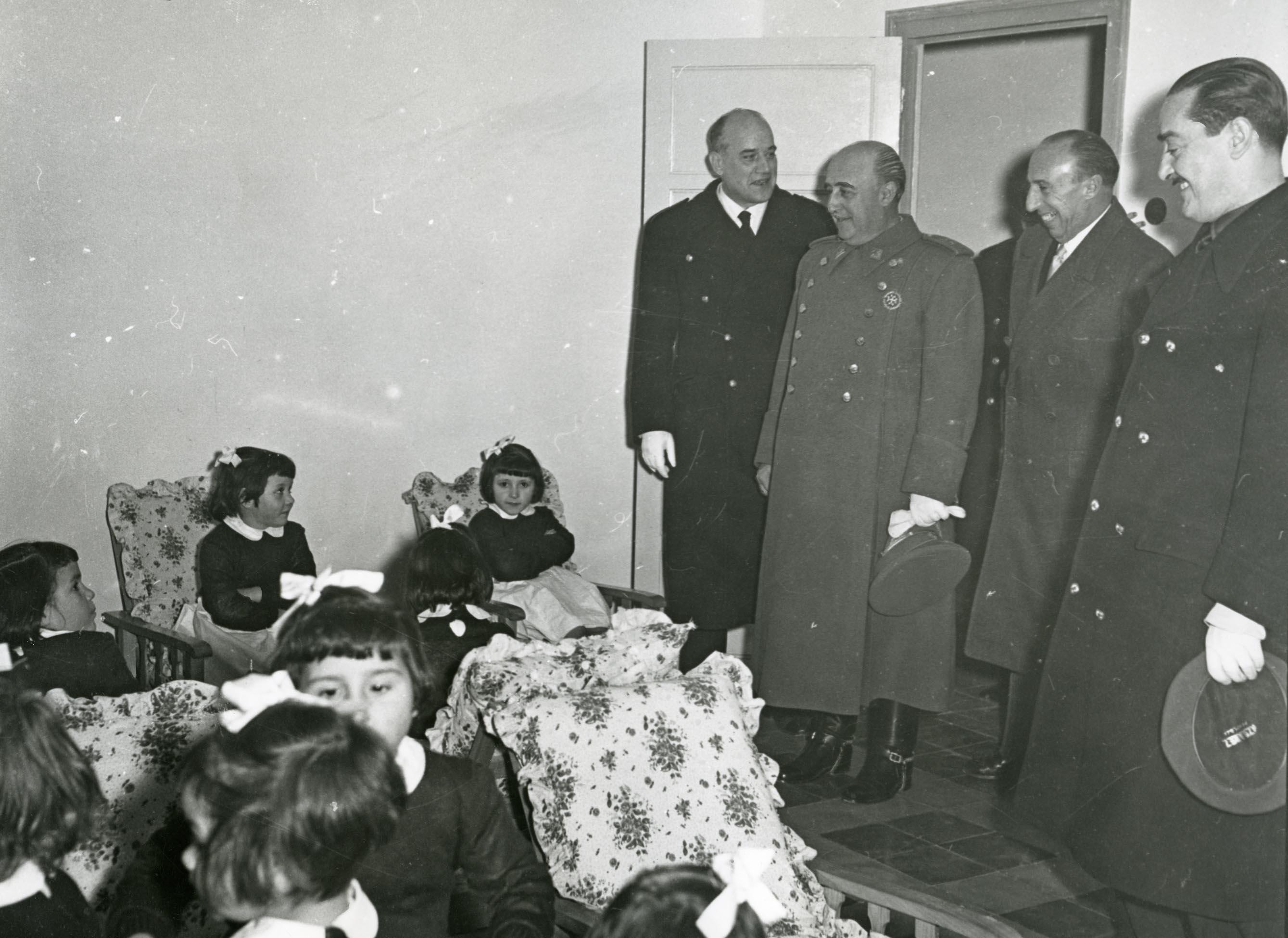 Detalle de la visita del jefe del Estado, general Franco, al Jardín Maternal instalado por el Instituto Nacional de la Vivienda en el barrio de la Chantrea (conocido popularmente como Casa Cunas), en Pamplona. A la izquierda, el general Francisco Franco Bahamonde accede a una dependencia acompañado por una autoridad, Federico Mayo Gayarre, director del Instituto Nacional de la Vivienda, y por Luis Valero Bermejo, gobernador civil de Navarra. A la izquierda, un grupo de niñas del centro.