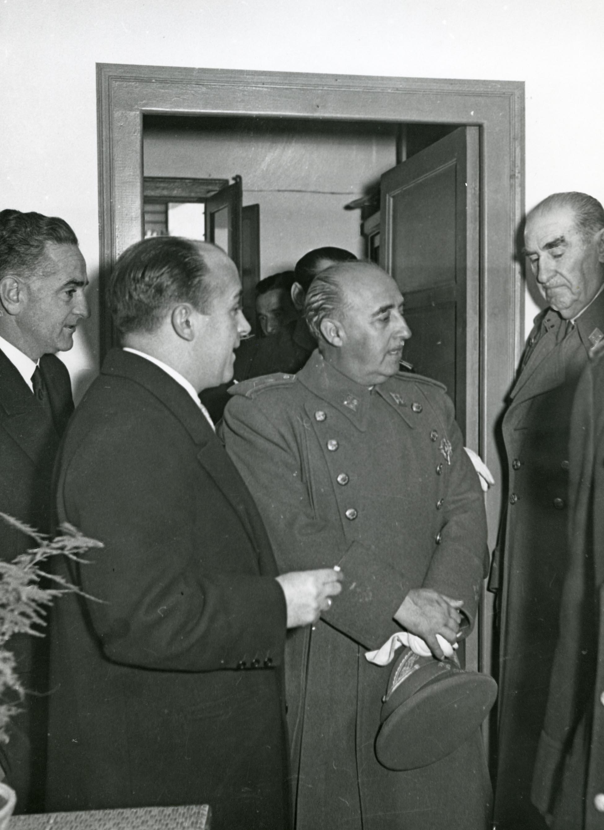 Detalle de la visita del jefe del Estado, general Franco, a una vivienda protegida construida por el Instituto Nacional de la Vivienda en el barrio de la Chantrea, en Pamplona. En el centro, el general Francisco Franco Bahamonde en una estancia de la vivienda, flanqueado por un hombre y dos miembros de la comitiva.