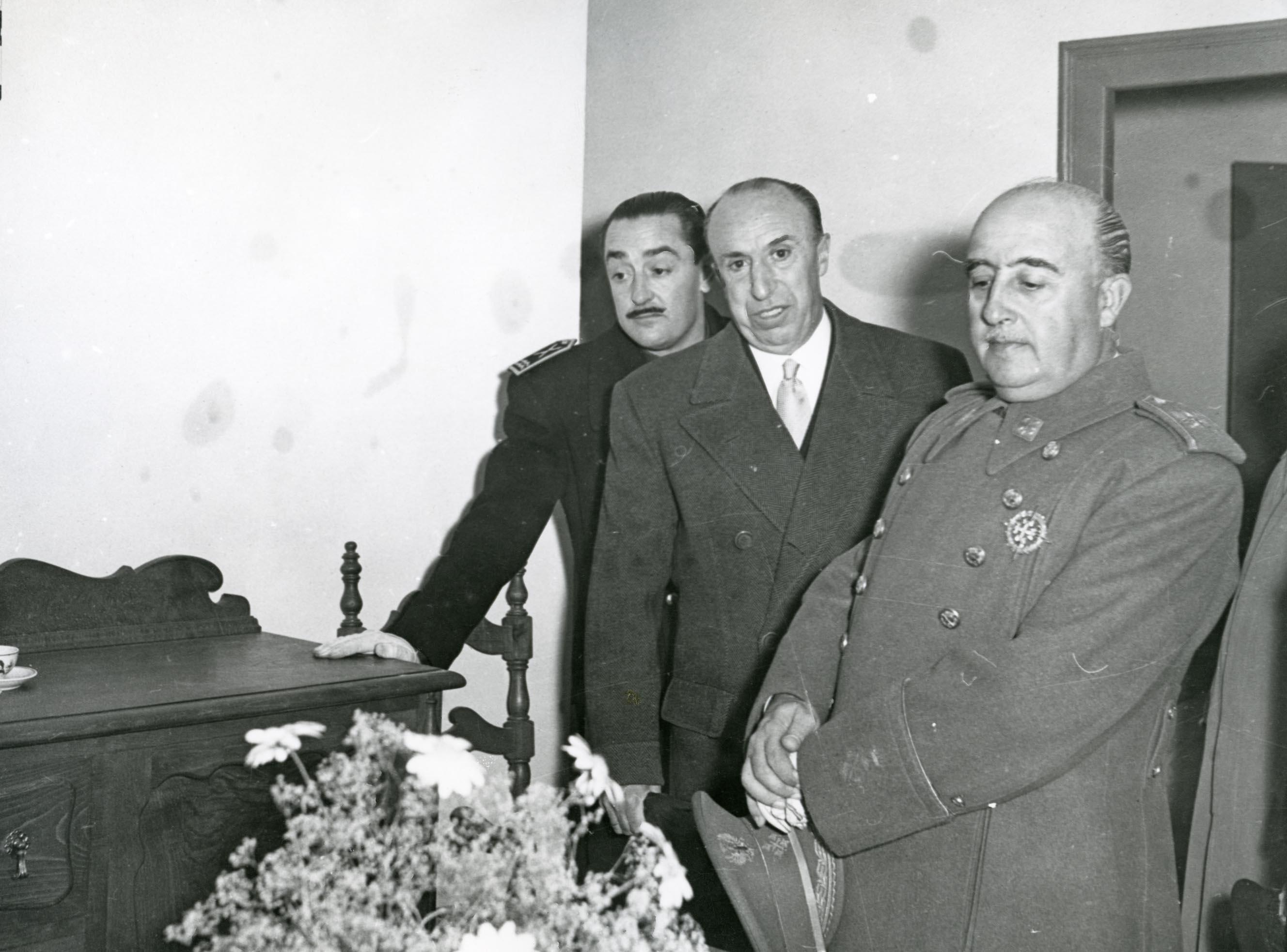 Detalle de la visita del jefe del Estado, general Franco, a una vivienda protegida construida por el Instituto Nacional de la Vivienda en el barrio de la Chantrea, en Pamplona. En el salón de la vivienda, una autoridad; Federico Mayo Gayarre, director del Instituto Nacional de Vivienda; y el general Francisco Franco Bahamonde.