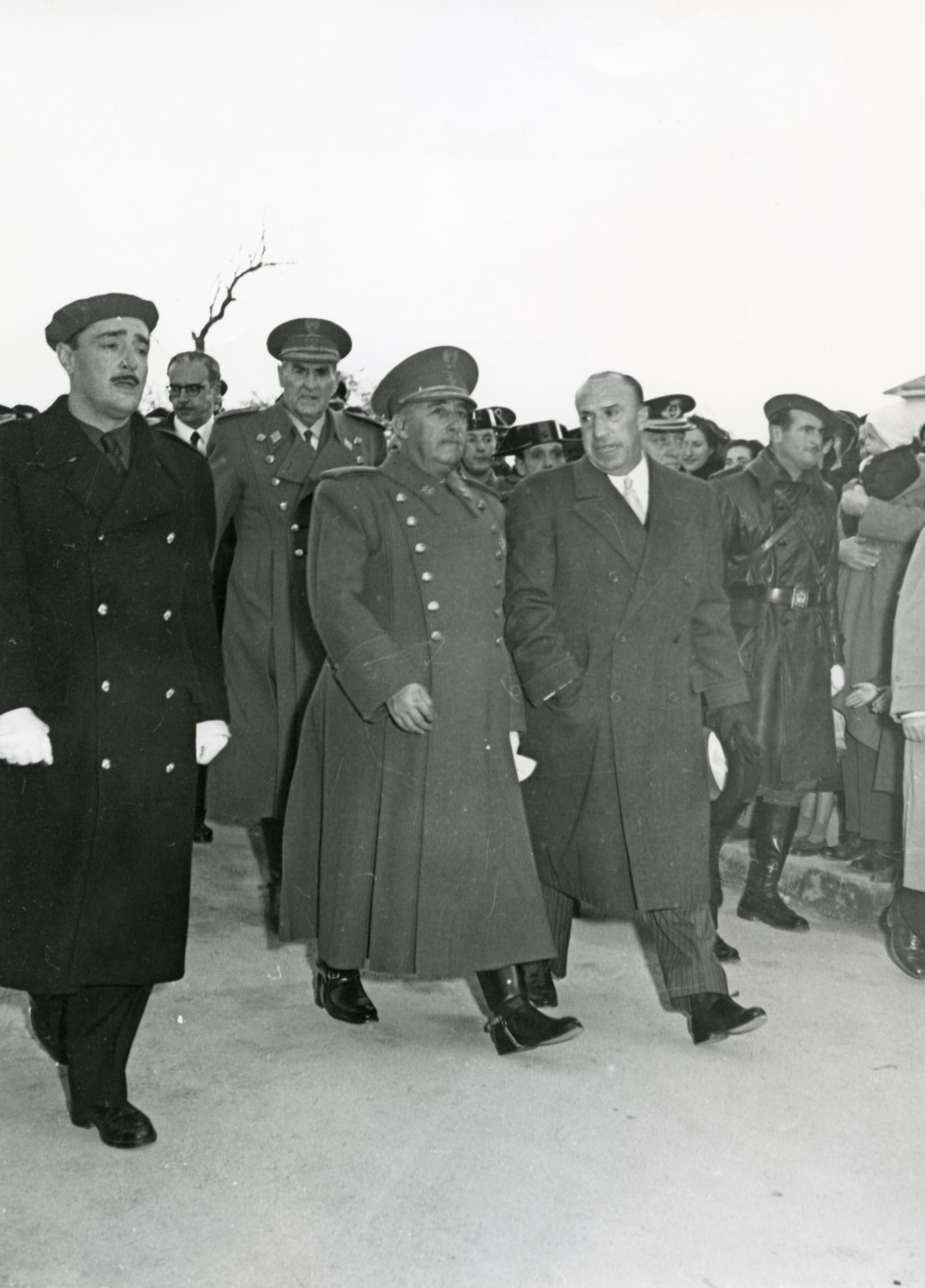 Vista general del recorrido del jefe del Estado, general Franco, por las calles del barrio de la Chantrea en Pamplona durante su viaje a Navarra. En primer término avanzan por una calle del barrio Luis Valero Bermejo, gobernador civil de Navarra, el general Francisco Franco Bahamonde y Federico Mayo Gayarre, director del Instituto Nacional de la Vivienda. Tras ellos caminan otros miembros civiles y militares de la comitiva.
