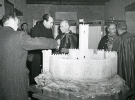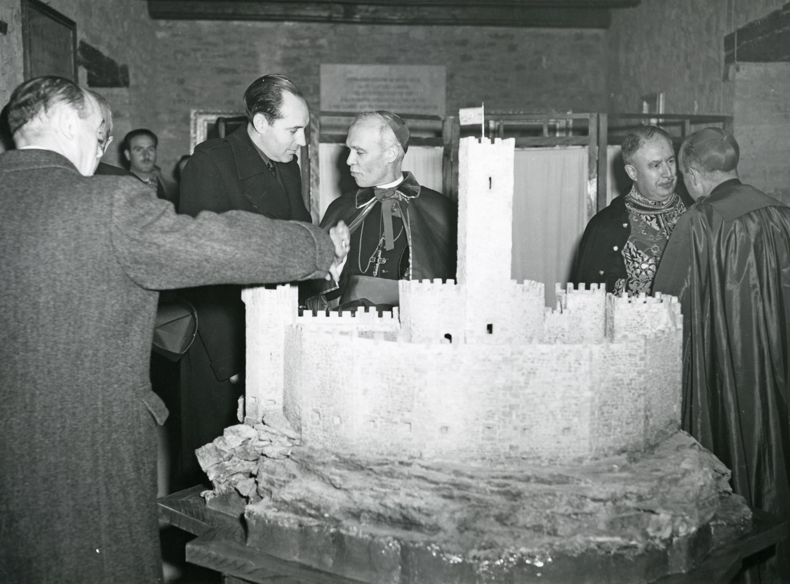 Vista parcial de la visita cursada por el jefe del Estado, general Franco, y su comitiva al castillo de Javier durante su viaje a Navarra, con motivo de la clausura de los actos conmemorativos del IV centenario de la muerte de San Francisco Javier. En primer término, un grupo de autoridades ante la maqueta del castillo. A la izquierda, de espaldas, el arquitecto José Yárnoz Larrosa y otra autoridad (oculta tras él). En el centro, un miembro de la casa del jefe del Estado conversa con Manuel Frindade Salgueiro, obispo auxiliar del patriarcado de Lisboa y arzobispo honorífico de Mitilene. A la derecha, un miembro del gobierno conversa con otro prelado.